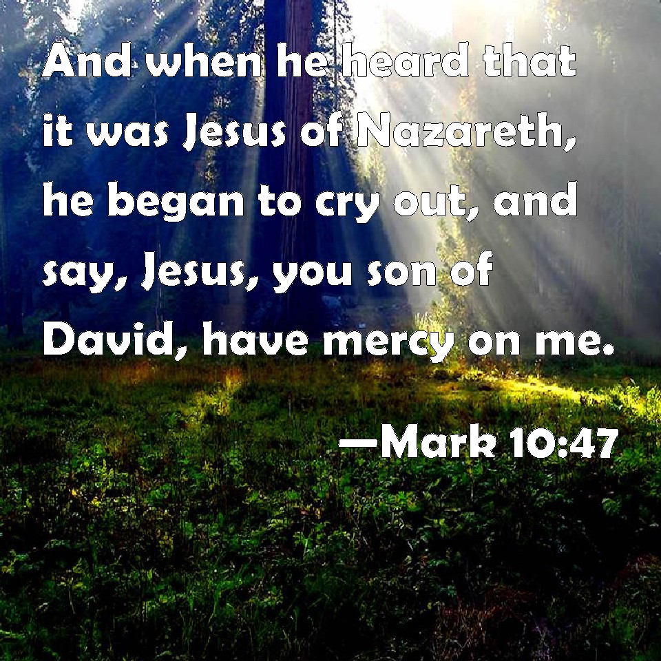 Choose a Background Mark 10:47 And when he heard that it was Jesus of Nazareth, he began to cry out, and say, Jesus, you son of David, have mercy on me. KJV: And when he heard that it was Jesus of Nazareth, he began to cry out, and say, Jesus, thou Son of David, have mercy on me. DRB: Who when he had heard, that it was Jesus of Nazareth, began to cry out, and to say: Jesus son of David, have mercy on me. DBT: And having heard that it was Jesus the Nazaraean, he began to cry out and to say, O Son of David, Jesus, have mercy on me. ERV: And when he heard that it was Jesus of Nazareth, he began to cry out, and say, Jesus, thou son of David, have mercy on me. WBT: And when he heard that it was Jesus of Nazareth, he began to cry out, and say, Jesus, thou son of David, have mercy on me. WEB: When he heard that it was Jesus the Nazarene, he began to cry out, and say, "Jesus, you son of David, have mercy on me!" YLT: and having heard that it is Jesus the Nazarene, he began to cry out, and to say, 'The Son of David — Jesus! deal kindly with me;'Links Mark 10:47 NIV • Mark 10:47 NLT • Mark 10:47 ESV • Mark 10:47 NASB • Mark 10:47 KJV • Mark 10:47 Interlinear • Mark 10:47 Commentaries • Mark 10:47 Parallel Texts • Mark 10:47 Bible Apps • Mark 10:47 Parallel • Bible Hub |