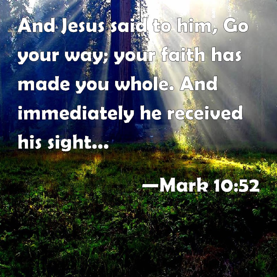 Choose a Background Mark 10:52 And Jesus said to him, Go your way; your faith has made you whole. And immediately he received his sight, and followed Jesus in the way. KJV: And Jesus said unto him, Go thy way; thy faith hath made thee whole. And immediately he received his sight, and followed Jesus in the way. DRB: And Jesus saith to him: Go thy way, thy faith hath made thee whole. And immediately he saw, and followed him in the way. DBT: And Jesus said to him, Go, thy faith has healed thee. And he saw immediately, and followed him in the way. ERV: And Jesus said unto him, Go thy way; thy faith hath made thee whole. And straightway he received his sight, and followed him in the way. WBT: And Jesus said to him, Go, thy faith hath made thee whole. And immediately he received his sight, and followed Jesus in the way. WEB: Jesus said to him, "Go your way. Your faith has made you well." Immediately he received his sight, and followed Jesus in the way. YLT: and Jesus said to him, 'Go, thy faith hath saved thee:' and immediately he saw again, and was following Jesus in the way.Links Mark 10:52 NIV • Mark 10:52 NLT • Mark 10:52 ESV • Mark 10:52 NASB • Mark 10:52 KJV • Mark 10:52 Interlinear • Mark 10:52 Commentaries • Mark 10:52 Parallel Texts • Mark 10:52 Bible Apps • Mark 10:52 Parallel • Bible Hub |