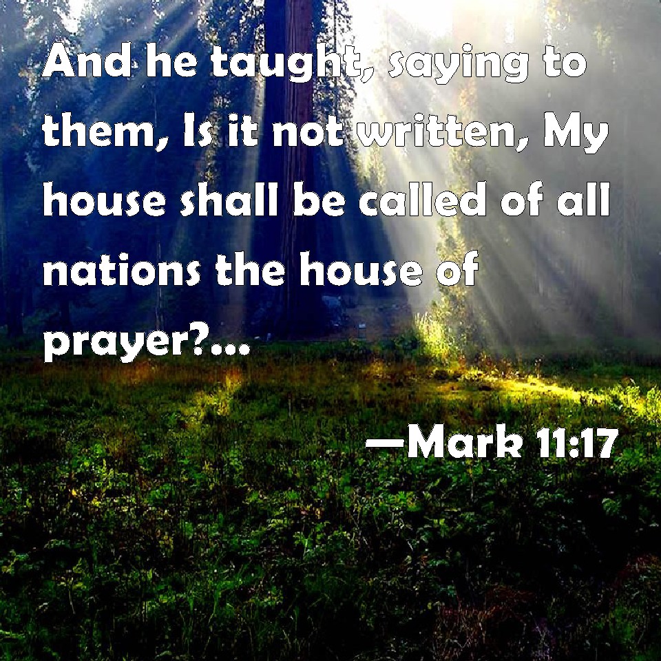 Choose a Background Mark 11:17 And he taught, saying to them, Is it not written, My house shall be called of all nations the house of prayer? but you have made it a den of thieves. KJV: And he taught, saying unto them, Is it not written, My house shall be called of all nations the house of prayer? but ye have made it a den of thieves. DRB: And he taught, saying to them: Is it not written, My house shall be called the house of prayer to all nations? But you have made it a den of thieves. DBT: And he taught saying to them, Is it not written, My house shall be called a house of prayer for all the nations? but ye have made it a den of robbers. ERV: And he taught, and said unto them, Is it not written, My house shall be called a house of prayer for all the nations? but ye have made it a den of robbers. WBT: And he taught, saying to them, Is it not written, My house shall be called by all nations the house of prayer? but ye have made it a den of thieves. WEB: He taught, saying to them, "Isn't it written, 'My house will be called a house of prayer for all the nations?' But you have made it a den of robbers!" YLT: and he was teaching, saying to them, 'Hath it not been written — My house a house of prayer shall be called for all the nations, and ye did make it a den of robbers?'Links Mark 11:17 NIV • Mark 11:17 NLT • Mark 11:17 ESV • Mark 11:17 NASB • Mark 11:17 KJV • Mark 11:17 Interlinear • Mark 11:17 Commentaries • Mark 11:17 Parallel Texts • Mark 11:17 Bible Apps • Mark 11:17 Parallel • Bible Hub |