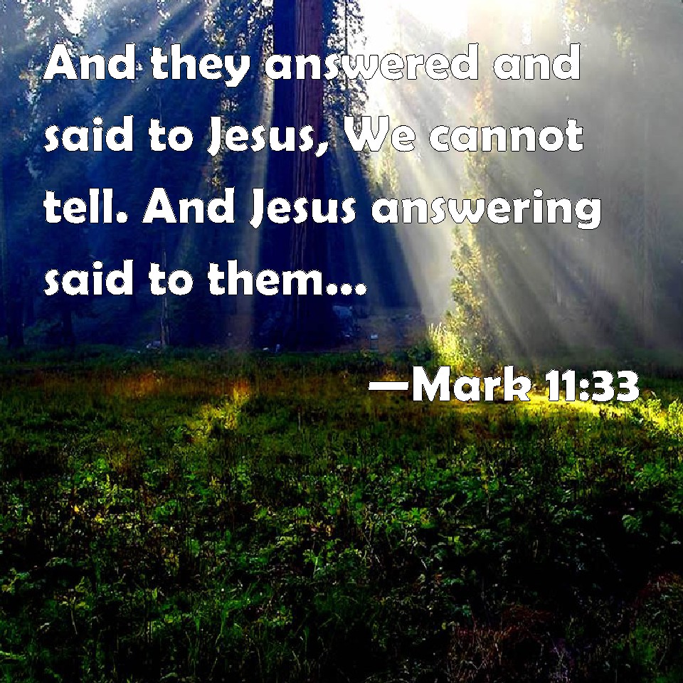 Choose a Background Mark 11:33 And they answered and said to Jesus, We cannot tell. And Jesus answering said to them, Neither do I tell you by what authority I do these things. KJV: And they answered and said unto Jesus, We cannot tell. And Jesus answering saith unto them, Neither do I tell you by what authority I do these things. DRB: And they answering, say to Jesus: We know not. And Jesus answering, saith to them: Neither do I tell you by what authority I do these things. DBT: And they answering say to Jesus, We do not know. And Jesus answering says to them, Neither do I tell you by what authority I do these things. ERV: And they answered Jesus and say, We know not. And Jesus saith unto them, Neither tell I you by what authority I do these things. WBT: And they answered and said to Jesus, We cannot tell. And Jesus answering saith to them, Neither do I tell you by what authority I do these things. WEB: They answered Jesus, "We don't know." Jesus said to them, "Neither do I tell you by what authority I do these things." YLT: and answering they say to Jesus, 'We have not known;' and Jesus answering saith to them, 'Neither do I tell you by what authority I do these things.'Links Mark 11:33 NIV • Mark 11:33 NLT • Mark 11:33 ESV • Mark 11:33 NASB • Mark 11:33 KJV • Mark 11:33 Interlinear • Mark 11:33 Commentaries • Mark 11:33 Parallel Texts • Mark 11:33 Bible Apps • Mark 11:33 Parallel • Bible Hub |