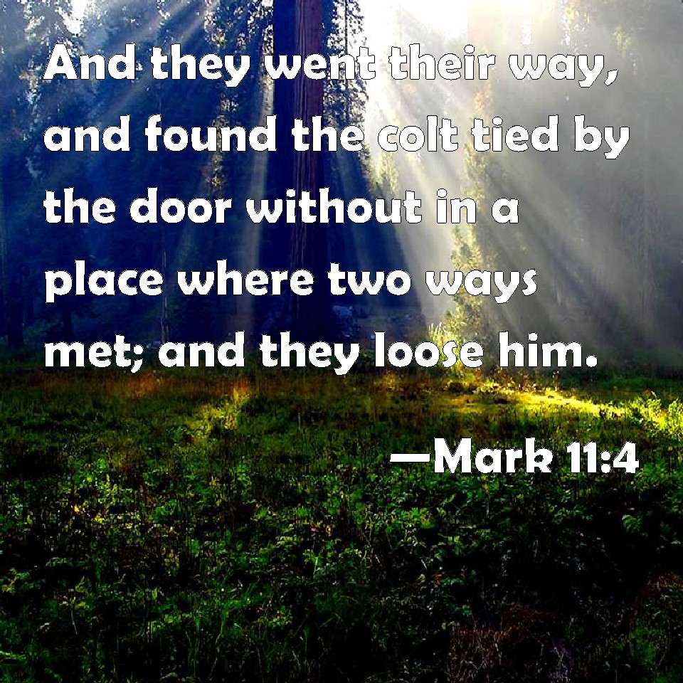 Choose a Background Mark 11:4 And they went their way, and found the colt tied by the door without in a place where two ways met; and they loose him. KJV: And they went their way, and found the colt tied by the door without in a place where two ways met; and they loose him. DRB: And going their way, they found the colt tied before the gate without, in the meeting of two ways: and they loose him. DBT: And they departed, and found a colt bound to the door without at the crossway, and they loose him. ERV: And they went away, and found a colt tied at the door without in the open street; and they loose him. WBT: And they went, and found the colt tied by the door without, in a place where two ways met; and they loose him. WEB: They went away, and found a young donkey tied at the door outside in the open street, and they untied him. YLT: And they went away, and found the colt tied at the door without, by the two ways, and they loose it,Links Mark 11:4 NIV • Mark 11:4 NLT • Mark 11:4 ESV • Mark 11:4 NASB • Mark 11:4 KJV • Mark 11:4 Interlinear • Mark 11:4 Commentaries • Mark 11:4 Parallel Texts • Mark 11:4 Bible Apps • Mark 11:4 Parallel • Bible Hub |