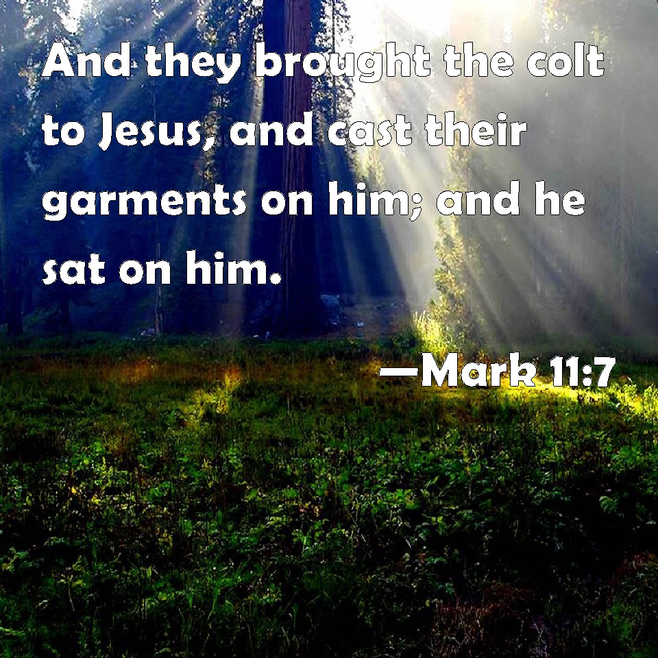 Choose a Background Mark 11:7 And they brought the colt to Jesus, and cast their garments on him; and he sat on him. KJV: And they brought the colt to Jesus, and cast their garments on him; and he sat upon him. DRB: And they brought the colt to Jesus; and they lay their garments on him, and he sat upon him. DBT: And they led the colt to Jesus, and cast their clothes upon it, and he sat on it; ERV: And they bring the colt unto Jesus, and cast on him their garments; and he sat upon him. WBT: And they brought the colt to Jesus, and cast their garments on him; and he sat upon him. WEB: They brought the young donkey to Jesus, and threw their garments on it, and Jesus sat on it. YLT: And they brought the colt unto Jesus, and did cast upon it their garments, and he sat upon it,Links Mark 11:7 NIV • Mark 11:7 NLT • Mark 11:7 ESV • Mark 11:7 NASB • Mark 11:7 KJV • Mark 11:7 Interlinear • Mark 11:7 Commentaries • Mark 11:7 Parallel Texts • Mark 11:7 Bible Apps • Mark 11:7 Parallel • Bible Hub |