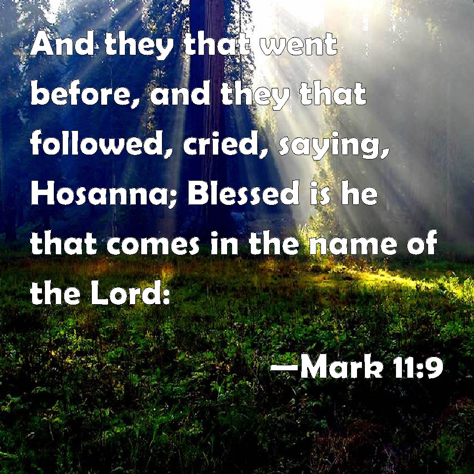 Choose a Background Mark 11:9 And they that went before, and they that followed, cried, saying, Hosanna; Blessed is he that comes in the name of the Lord: KJV: And they that went before, and they that followed, cried, saying, Hosanna; Blessed is he that cometh in the name of the Lord: DRB: And they that went before and they that followed, cried, saying: Hosanna, blessed is he that cometh in the name of the Lord. DBT: And those going on before and those following cried out, Hosanna! blessed be he that comes in the Lord's name. ERV: And they that went before, and they that followed, cried, Hosanna; Blessed is he that cometh in the name of the Lord: WBT: And they that went before, and they that followed, cried, saying, Hosanna: Blessed is he that cometh in the name of the Lord. WEB: Those who went in front, and those who followed, cried out, "Hosanna! Blessed is he who comes in the name of the Lord! YLT: And those going before and those following were crying out, saying, 'Hosanna! blessed is he who is coming in the name of the Lord;Links Mark 11:9 NIV • Mark 11:9 NLT • Mark 11:9 ESV • Mark 11:9 NASB • Mark 11:9 KJV • Mark 11:9 Interlinear • Mark 11:9 Commentaries • Mark 11:9 Parallel Texts • Mark 11:9 Bible Apps • Mark 11:9 Parallel • Bible Hub |