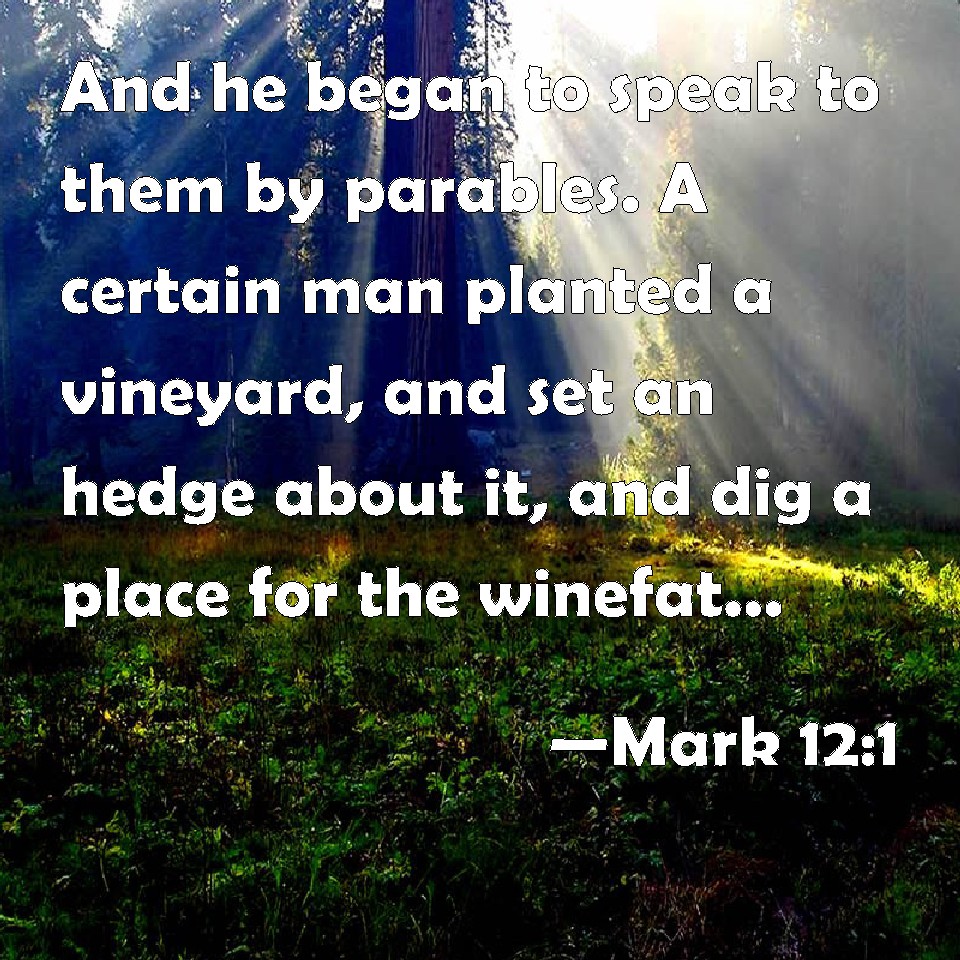 Choose a Background Mark 12:1 And he began to speak to them by parables. A certain man planted a vineyard, and set an hedge about it, and dig a place for the winefat, and built a tower, and let it out to farmers, and went into a far country. KJV: And he began to speak unto them by parables. A certain man planted a vineyard, and set an hedge about it, and digged a place for the winefat, and built a tower, and let it out to husbandmen, and went into a far country. DRB: AND he began to speak to them in parables: A certain man planted a vineyard and made a hedge about it, and dug a place for the winefat, and built a tower, and let it to husbandmen; and went into a far country. DBT: And he began to say to them in parables, A man planted a vineyard, and made a fence round it and dug a wine-vat, and built a tower, and let it out to husbandmen, and left the country. ERV: And he began to speak unto them in parables. A man planted a vineyard, and set a hedge about it, and digged a pit for the winepress, and built a tower, and let it out to husbandmen, and went into another country. WBT: And he began to speak to them by parables. A certain man planted a vineyard, and set a hedge about it, and digged a place for the wine-vat, and built a tower, and let it out to husbandmen, and went into a far country. WEB: He began to speak to them in parables. "A man planted a vineyard, put a hedge around it, dug a pit for the winepress, built a tower, rented it out to a farmer, and went into another country. YLT: And he began to speak to them in similes: 'A man planted a vineyard, and put a hedge around, and digged an under-wine-vat, and built a tower, and gave it out to husbandmen, and went abroad;Links Mark 12:1 NIV • Mark 12:1 NLT • Mark 12:1 ESV • Mark 12:1 NASB • Mark 12:1 KJV • Mark 12:1 Interlinear • Mark 12:1 Commentaries • Mark 12:1 Parallel Texts • Mark 12:1 Bible Apps • Mark 12:1 Parallel • Bible Hub |