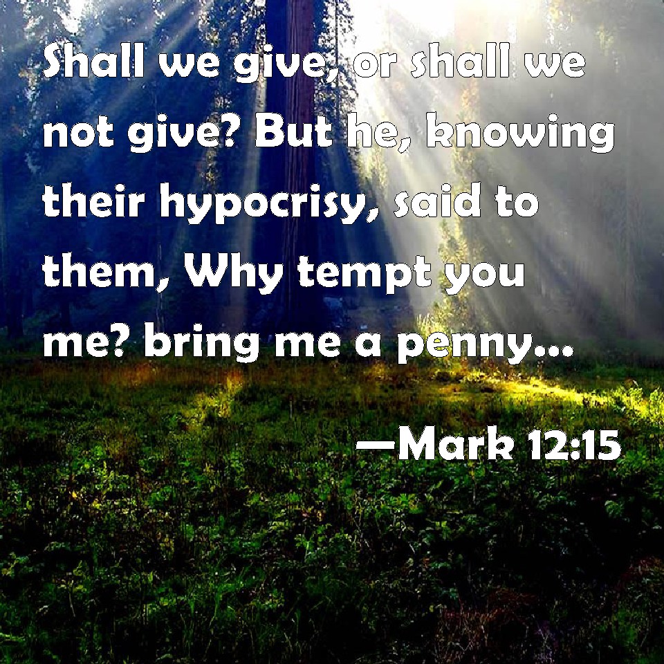 Choose a Background Mark 12:15 Shall we give, or shall we not give? But he, knowing their hypocrisy, said to them, Why tempt you me? bring me a penny, that I may see it. KJV: Shall we give, or shall we not give? But he, knowing their hypocrisy, said unto them, Why tempt ye me? bring me a penny, that I may see it. DRB: Who knowing their wiliness, saith to them: Why tempt you me? bring me a penny that I may see it. DBT: Should we give, or should we not give? But he knowing their hypocrisy said unto them, Why tempt ye me? Bring me a denarius that I may see it. ERV: Shall we give, or shall we not give? But he, knowing their hypocrisy, said unto them, Why tempt ye me? bring me a penny, that I may see it. WBT: Shall we give, or shall we not give? But he, knowing their hypocrisy, said to them, Why tempt ye me? bring me a penny, that I may see it. WEB: Shall we give, or shall we not give?" But he, knowing their hypocrisy, said to them, "Why do you test me? Bring me a denarius, that I may see it." YLT: And he, knowing their hypocrisy, said to them, 'Why me do ye tempt? bring me a denary, that I may see;'Links Mark 12:15 NIV • Mark 12:15 NLT • Mark 12:15 ESV • Mark 12:15 NASB • Mark 12:15 KJV • Mark 12:15 Interlinear • Mark 12:15 Commentaries • Mark 12:15 Parallel Texts • Mark 12:15 Bible Apps • Mark 12:15 Parallel • Bible Hub |