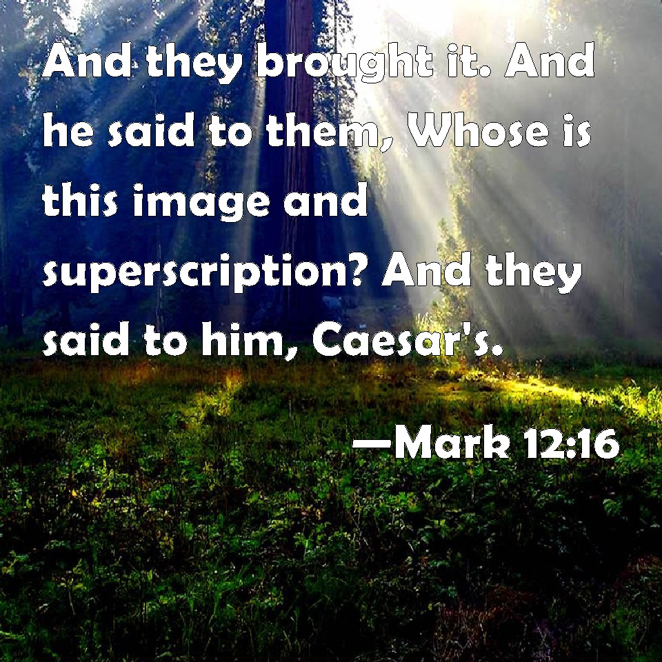 Choose a Background Mark 12:16 And they brought it. And he said to them, Whose is this image and superscription? And they said to him, Caesar's. KJV: And they brought it. And he saith unto them, Whose is this image and superscription? And they said unto him, Caesar's. DRB: And they brought it him. And he saith to them: Whose is this image and inscription? They say to him, Caesar's. DBT: And they brought it. And he says to them, Whose is this image and superscription? And they said to him, Caesar's. ERV: And they brought it. And he saith unto them, Whose is this image and superscription? And they said unto him, Caesar's. WBT: And they brought it: and he saith to them, Whose is this image and superscription? And they said to him, Cesar's. WEB: They brought it. He said to them, "Whose is this image and inscription?" They said to him, "Caesar's." YLT: and they brought, and he saith to them, 'Whose is this image, and the inscription?' and they said to him, 'Caesar's;'Links Mark 12:16 NIV • Mark 12:16 NLT • Mark 12:16 ESV • Mark 12:16 NASB • Mark 12:16 KJV • Mark 12:16 Interlinear • Mark 12:16 Commentaries • Mark 12:16 Parallel Texts • Mark 12:16 Bible Apps • Mark 12:16 Parallel • Bible Hub |
