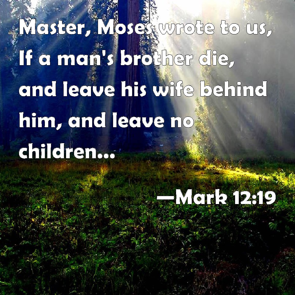 Choose a Background Mark 12:19 Master, Moses wrote to us, If a man's brother die, and leave his wife behind him, and leave no children, that his brother should take his wife, and raise up seed to his brother. KJV: Master, Moses wrote unto us, If a man's brother die, and leave his wife behind him, and leave no children, that his brother should take his wife, and raise up seed unto his brother. DRB: Master, Moses wrote unto us, that if any man's brother die, and leave his wife behind him, and leave no children, his brother should take his wife, and raise up seed to his brother. DBT: Teacher, Moses wrote to us that if any one's brother die, and leave a wife behind, and leave no children, that his brother shall take his wife, and raise up seed to his brother. ERV: Master, Moses wrote unto us, If a man's brother die, and leave a wife behind him, and leave no child, that his brother should take his wife, and raise up seed unto his brother. WBT: Master, Moses wrote to us, If a man's brother shall die, and leave his wife, and leave no children, that his brother should take his wife, and raise seed to his brother. WEB: "Teacher, Moses wrote to us, 'If a man's brother dies, and leaves a wife behind him, and leaves no children, that his brother should take his wife, and raise up offspring for his brother.' YLT: 'Teacher, Moses wrote to us, that if any one's brother may die, and may leave a wife, and may leave no children, that his brother may take his wife, and raise up seed to his brother.Links Mark 12:19 NIV • Mark 12:19 NLT • Mark 12:19 ESV • Mark 12:19 NASB • Mark 12:19 KJV • Mark 12:19 Interlinear • Mark 12:19 Commentaries • Mark 12:19 Parallel Texts • Mark 12:19 Bible Apps • Mark 12:19 Parallel • Bible Hub |
