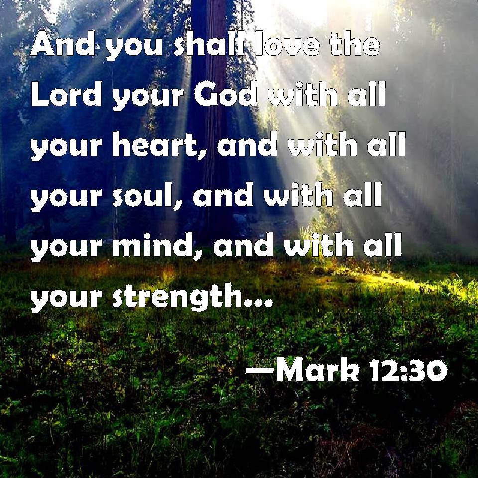 Choose a Background Mark 12:30 And you shall love the Lord your God with all your heart, and with all your soul, and with all your mind, and with all your strength: this is the first commandment. KJV: And thou shalt love the Lord thy God with all thy heart, and with all thy soul, and with all thy mind, and with all thy strength: this is the first commandment. DRB: And thou shalt love the Lord thy God, with thy whole heart, and with thy whole soul, and with thy whole mind, and with thy whole strength. This is the first commandment. DBT: and thou shalt love the Lord thy God with all thy heart, and with all thy soul, and with all thine understanding, and with all thy strength. This is the first commandment. ERV: and thou shalt love the Lord thy God with all thy heart, and with all thy soul, and with all thy mind, and with all thy strength. WBT: And thou shalt love the Lord thy God with all thy heart, and with all thy soul, and with all thy mind, and with all thy strength: this is the first commandment. WEB: you shall love the Lord your God with all your heart, and with all your soul, and with all your mind, and with all your strength.' This is the first commandment. YLT: and thou shalt love the Lord thy God out of all thy heart, and out of thy soul, and out of all thine understanding, and out of all thy strength — this is the first command;Links Mark 12:30 NIV • Mark 12:30 NLT • Mark 12:30 ESV • Mark 12:30 NASB • Mark 12:30 KJV • Mark 12:30 Interlinear • Mark 12:30 Commentaries • Mark 12:30 Parallel Texts • Mark 12:30 Bible Apps • Mark 12:30 Parallel • Bible Hub |
