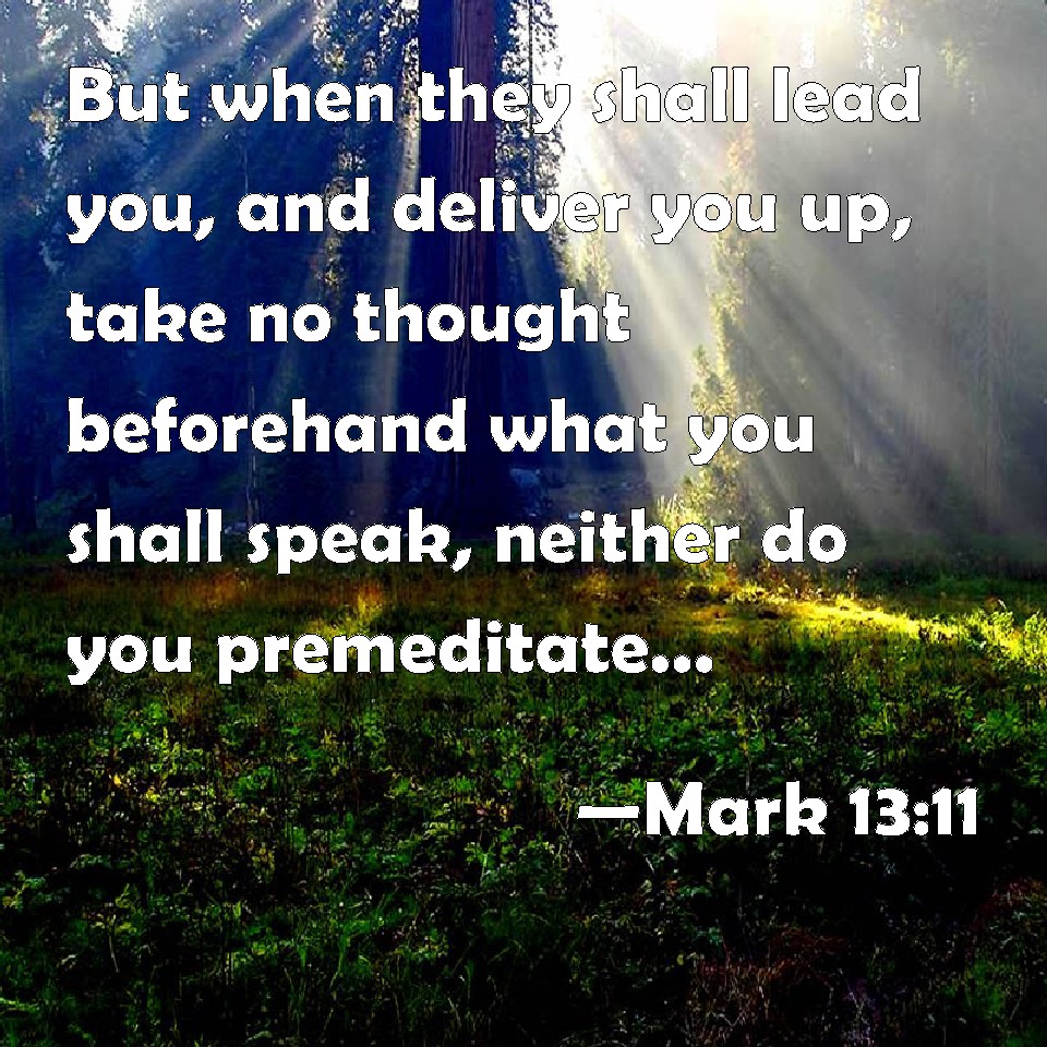 Choose a Background Mark 13:11 But when they shall lead you, and deliver you up, take no thought beforehand what you shall speak, neither do you premeditate: but whatever shall be given you in that hour, that speak you: for it is not you that speak, but the Holy Ghost. KJV: But when they shall lead you, and deliver you up, take no thought beforehand what ye shall speak, neither do ye premeditate: but whatsoever shall be given you in that hour, that speak ye: for it is not ye that speak, but the Holy Ghost. DRB: And when they shall lead you and deliver you up, be not thoughtful beforehand what you shall speak; but whatsoever shall be given you in that hour, that speak ye. For it is not you that speak, but the Holy Ghost. DBT: But when they shall lead you away to deliver you up, be not careful beforehand as to what ye shall say, nor prepare your discourse: but whatsoever shall be given you in that hour, that speak; for ye are not the speakers, but the Holy Spirit. ERV: And when they lead you to judgment, and deliver you up, be not anxious beforehand what ye shall speak: but whatsoever shall be given you in that hour, that speak ye: for it is not ye that speak, but the Holy Ghost. WBT: But when they shall lead you, and deliver you up, be not anxious beforehand what ye shall speak, neither do ye premeditate: but whatever shall be given you in that hour, that speak ye: for it is not ye that speak, but the Holy Spirit. WEB: When they lead you away and deliver you up, don't be anxious beforehand, or premeditate what you will say, but say whatever will be given you in that hour. For it is not you who speak, but the Holy Spirit. YLT: 'And when they may lead you, delivering up, be not anxious beforehand what ye may speak, nor premeditate, but whatever may be given to you in that hour, that speak ye, for it is not ye who are speaking, but the Holy Spirit.Links Mark 13:11 NIV • Mark 13:11 NLT • Mark 13:11 ESV • Mark 13:11 NASB • Mark 13:11 KJV • Mark 13:11 Interlinear • Mark 13:11 Commentaries • Mark 13:11 Parallel Texts • Mark 13:11 Bible Apps • Mark 13:11 Parallel • Bible Hub |