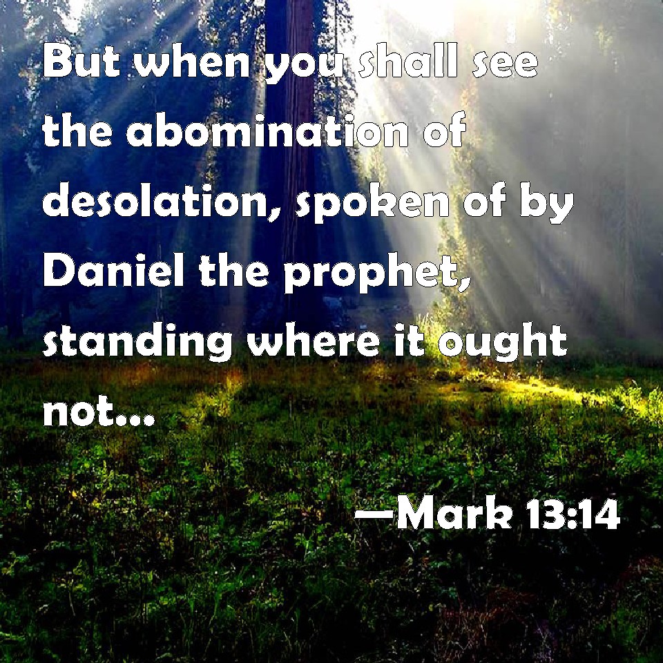 Choose a Background Mark 13:14 But when you shall see the abomination of desolation, spoken of by Daniel the prophet, standing where it ought not, (let him that reads understand,) then let them that be in Judaea flee to the mountains: KJV: But when ye shall see the abomination of desolation, spoken of by Daniel the prophet, standing where it ought not, (let him that readeth understand,) then let them that be in Judaea flee to the mountains: DRB: And when you shall see the abomination of desolation, standing where it ought not: he that readeth let him understand: then let them that are in Judea, flee unto the mountains: DBT: But when ye shall see the abomination of desolation standing where it should not, (he that reads let him consider it,) then let those in Judaea flee to the mountains; ERV: But when ye see the abomination of desolation standing where he ought not (let him that readeth understand), then let them that are in Judaea flee unto the mountains: WBT: But when ye shall see the abomination of desolation, spoken of by Daniel the prophet, standing where it ought not, (let him that readeth understand) then let them that are in Judea flee to the mountains: WEB: But when you see the abomination of desolation, spoken of by Daniel the prophet, standing where it ought not (let the reader understand), then let those who are in Judea flee to the mountains, YLT: 'And when ye may see the abomination of the desolation, that was spoken of by Daniel the prophet, standing where it ought not, (whoever is reading let him understand), then those in Judea, let them flee to the mountains;Links Mark 13:14 NIV • Mark 13:14 NLT • Mark 13:14 ESV • Mark 13:14 NASB • Mark 13:14 KJV • Mark 13:14 Interlinear • Mark 13:14 Commentaries • Mark 13:14 Parallel Texts • Mark 13:14 Bible Apps • Mark 13:14 Parallel • Bible Hub |