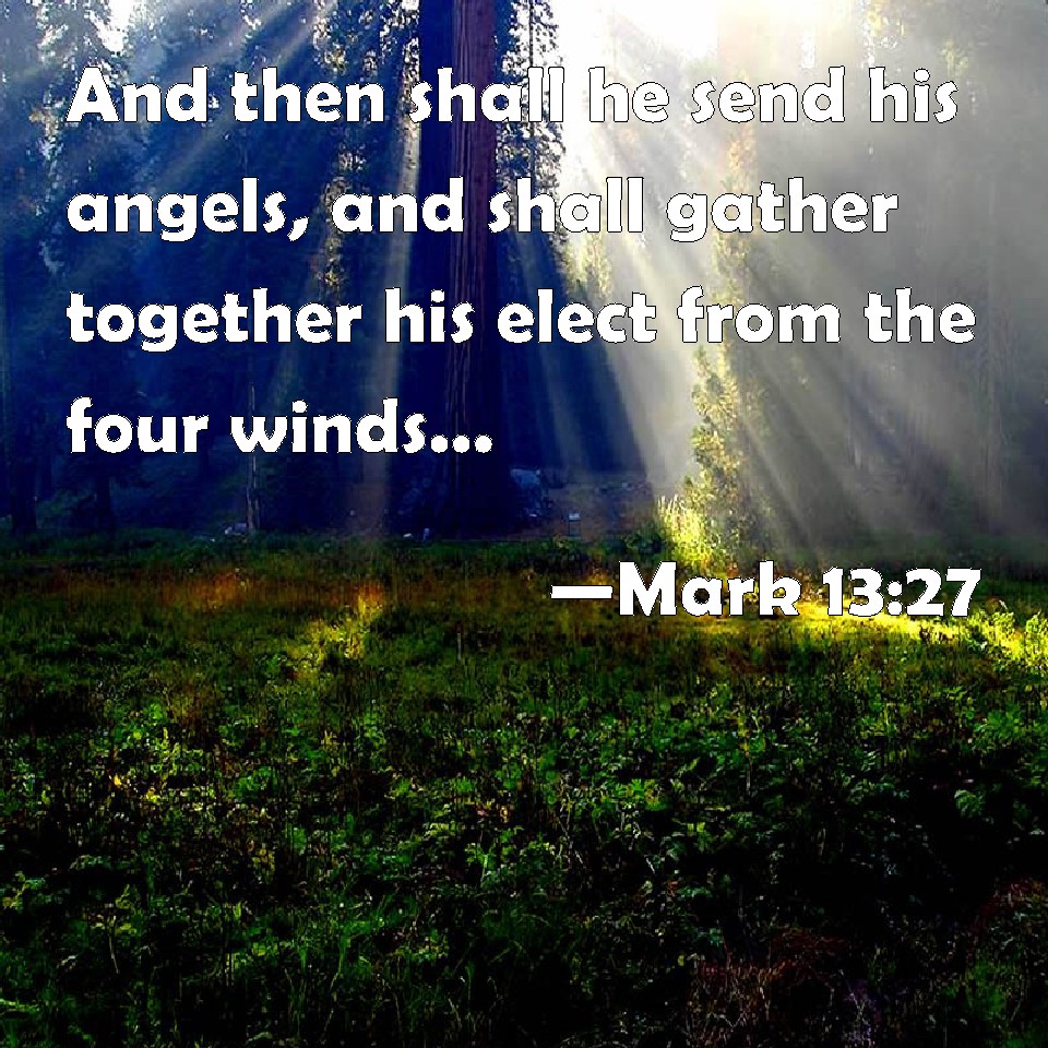 Choose a Background Mark 13:27 And then shall he send his angels, and shall gather together his elect from the four winds, from the uttermost part of the earth to the uttermost part of heaven. KJV: And then shall he send his angels, and shall gather together his elect from the four winds, from the uttermost part of the earth to the uttermost part of heaven. DRB: And then shall he send his angels, and shall gather together his elect from the four winds, from the uttermost part of the earth to the uttermost part of heaven. DBT: and then shall he send his angels and shall gather together his elect from the four winds, from end of earth to end of heaven. ERV: And then shall he send forth the angels, and shall gather together his elect from the four winds, from the uttermost part of the earth to the uttermost part of heaven. WBT: And then he will send his angels, and will assemble his elect from the four winds, from the uttermost part of the earth to the uttermost part of heaven. WEB: Then he will send out his angels, and will gather together his chosen ones from the four winds, from the ends of the earth to the ends of the sky. YLT: and then he shall send his messengers, and gather together his chosen from the four winds, from the end of the earth unto the end of heaven.Links Mark 13:27 NIV • Mark 13:27 NLT • Mark 13:27 ESV • Mark 13:27 NASB • Mark 13:27 KJV • Mark 13:27 Interlinear • Mark 13:27 Commentaries • Mark 13:27 Parallel Texts • Mark 13:27 Bible Apps • Mark 13:27 Parallel • Bible Hub |