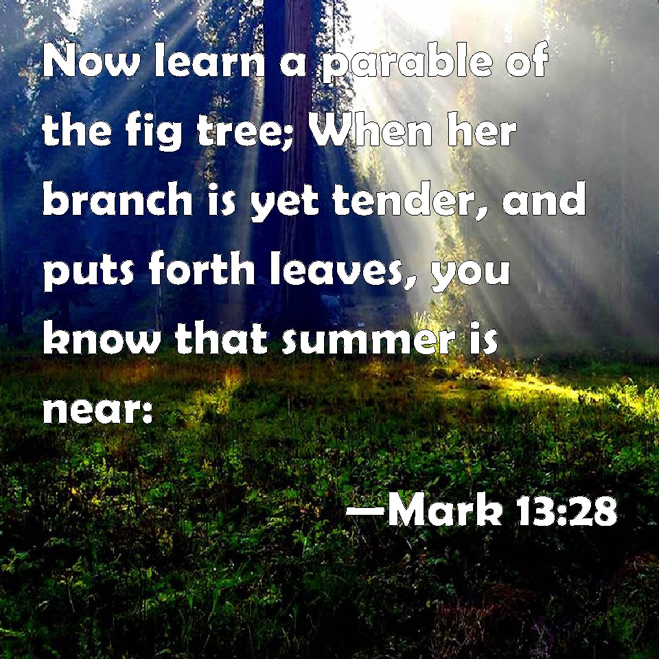 Choose a Background Mark 13:28 Now learn a parable of the fig tree; When her branch is yet tender, and puts forth leaves, you know that summer is near: KJV: Now learn a parable of the fig tree; When her branch is yet tender, and putteth forth leaves, ye know that summer is near: DRB: Now of the fig tree learn ye a parable. When the branch thereof is now tender, and the leaves are come forth, you know that summer is very near. DBT: But learn the parable from the fig-tree: when its branch already becomes tender and puts forth the leaves, ye know that the summer is near. ERV: Now from the fig tree learn her parable: when her branch is now become tender, and putteth forth its leaves, ye know that the summer is nigh; WBT: Now learn a parable of the fig-tree: When its branch is yet tender, and putteth forth leaves, ye know that summer is near: WEB: "Now from the fig tree, learn this parable. When the branch has now become tender, and puts forth its leaves, you know that the summer is near; YLT: 'And from the fig-tree learn ye the simile: when the branch may already become tender, and may put forth the leaves, ye know that nigh is the summer;Links Mark 13:28 NIV • Mark 13:28 NLT • Mark 13:28 ESV • Mark 13:28 NASB • Mark 13:28 KJV • Mark 13:28 Interlinear • Mark 13:28 Commentaries • Mark 13:28 Parallel Texts • Mark 13:28 Bible Apps • Mark 13:28 Parallel • Bible Hub |