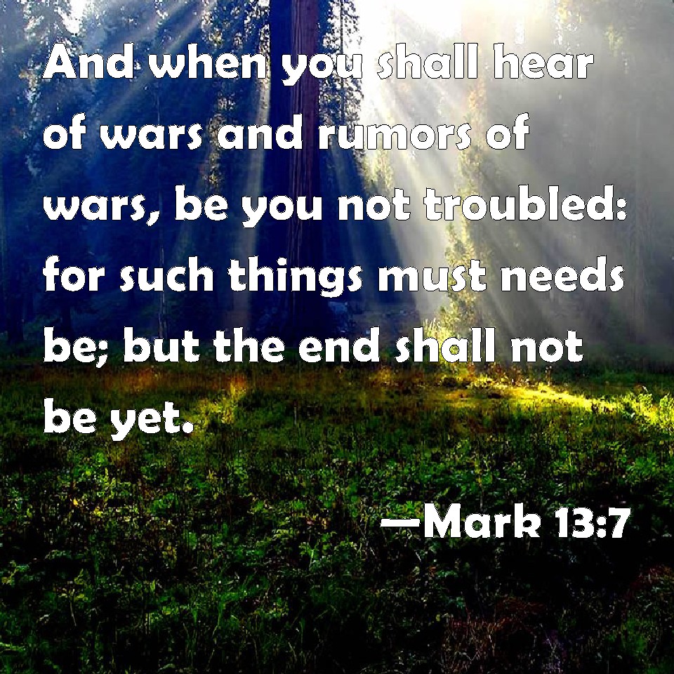 Choose a Background Mark 13:7 And when you shall hear of wars and rumors of wars, be you not troubled: for such things must needs be; but the end shall not be yet. KJV: And when ye shall hear of wars and rumours of wars, be ye not troubled: for such things must needs be; but the end shall not be yet. DRB: And when you shall hear of wars and rumours of wars, fear ye not. For such things must needs be, but the end is not yet. DBT: But when ye shall hear of wars and rumours of wars, be not disturbed, for this must happen, but the end is not yet. ERV: And when ye shall hear of wars and rumours of wars, be not troubled: these things must needs come to pass; but the end is not yet. WBT: And when ye shall hear of wars, and rumors of wars, be ye not troubled: for such things must needs be; but the end will not be yet. WEB: "When you hear of wars and rumors of wars, don't be troubled. For those must happen, but the end is not yet. YLT: and when ye may hear of wars and reports of wars, be not troubled, for these behove to be, but the end is not yet;Links Mark 13:7 NIV • Mark 13:7 NLT • Mark 13:7 ESV • Mark 13:7 NASB • Mark 13:7 KJV • Mark 13:7 Interlinear • Mark 13:7 Commentaries • Mark 13:7 Parallel Texts • Mark 13:7 Bible Apps • Mark 13:7 Parallel • Bible Hub |
