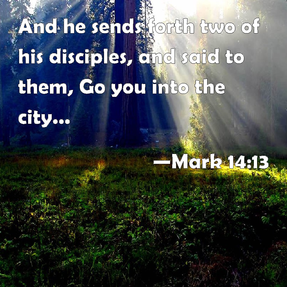 Choose a Background Mark 14:13 And he sends forth two of his disciples, and said to them, Go you into the city, and there shall meet you a man bearing a pitcher of water: follow him. KJV: And he sendeth forth two of his disciples, and saith unto them, Go ye into the city, and there shall meet you a man bearing a pitcher of water: follow him. DRB: And he sendeth two of his disciples, and saith to them: Go ye into the city; and there shall meet you a man carrying a pitcher of water, follow him; DBT: And he sends two of his disciples, and says to them, Go into the city, and a man shall meet you carrying a pitcher of water; follow him. ERV: And he sendeth two of his disciples, and saith unto them, Go into the city, and there shall meet you a man bearing a pitcher of water: follow him; WBT: And he sendeth two of his disciples, and saith to them, Go ye into the city, and there shall meet you a man bearing a pitcher of water: follow him. WEB: He sent two of his disciples, and said to them, "Go into the city, and there you will meet a man carrying a pitcher of water. Follow him, YLT: And he sendeth forth two of his disciples, and saith to them, 'Go ye away to the city, and there shall meet you a man bearing a pitcher of water, follow him;Links Mark 14:13 NIV • Mark 14:13 NLT • Mark 14:13 ESV • Mark 14:13 NASB • Mark 14:13 KJV • Mark 14:13 Interlinear • Mark 14:13 Commentaries • Mark 14:13 Parallel Texts • Mark 14:13 Bible Apps • Mark 14:13 Parallel • Bible Hub |