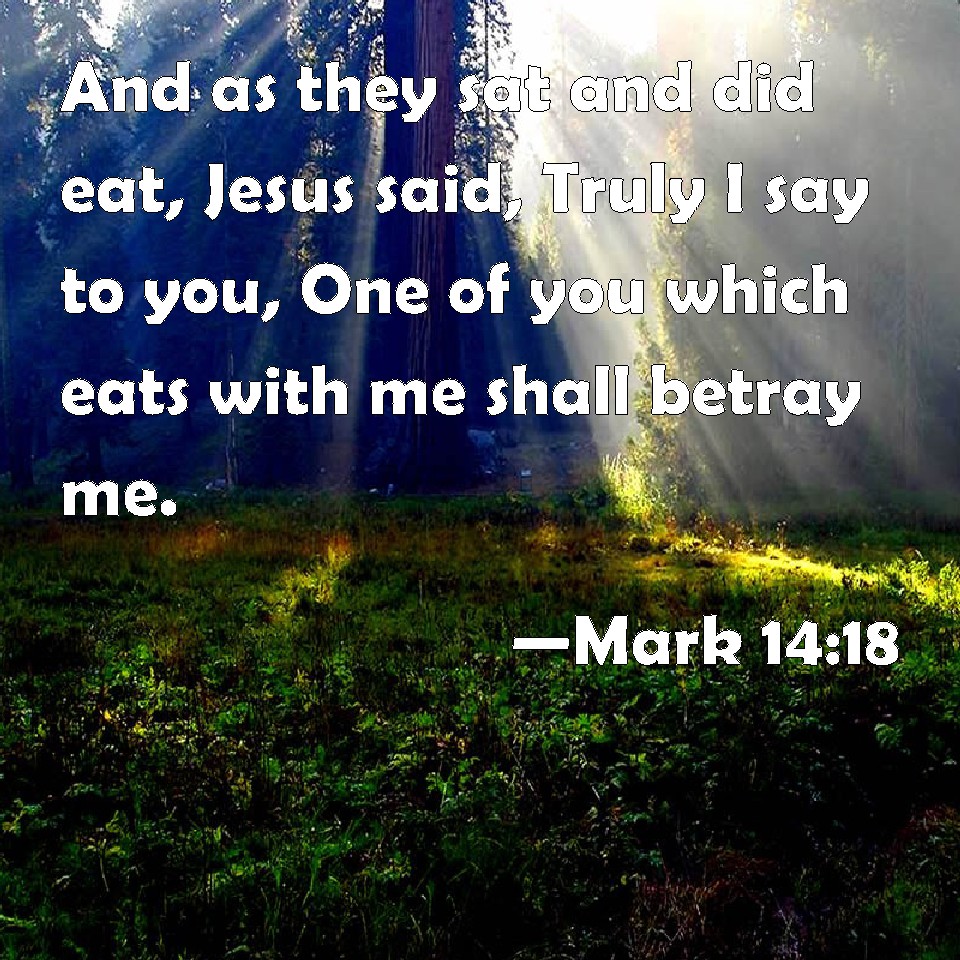 Choose a Background Mark 14:18 And as they sat and did eat, Jesus said, Truly I say to you, One of you which eats with me shall betray me. KJV: And as they sat and did eat, Jesus said, Verily I say unto you, One of you which eateth with me shall betray me. DRB: And when they were at table and eating, Jesus saith: Amen I say to you, one of you that eateth with me shall betray me. DBT: And as they lay at table and were eating, Jesus said, Verily I say to you, One of you shall deliver me up; he who is eating with me. ERV: And as they sat and were eating, Jesus said, Verily I say unto you, One of you shall betray me, even he that eateth with me. WBT: And as they sat, and were eating, Jesus said, Verily I say to you, One of you who eateth with me, will betray me. WEB: As they sat and were eating, Jesus said, "Most certainly I tell you, one of you will betray me—he who eats with me." YLT: and as they are reclining, and eating, Jesus said, 'Verily I say to you — one of you, who is eating with me — shall deliver me up.'Links Mark 14:18 NIV • Mark 14:18 NLT • Mark 14:18 ESV • Mark 14:18 NASB • Mark 14:18 KJV • Mark 14:18 Interlinear • Mark 14:18 Commentaries • Mark 14:18 Parallel Texts • Mark 14:18 Bible Apps • Mark 14:18 Parallel • Bible Hub |