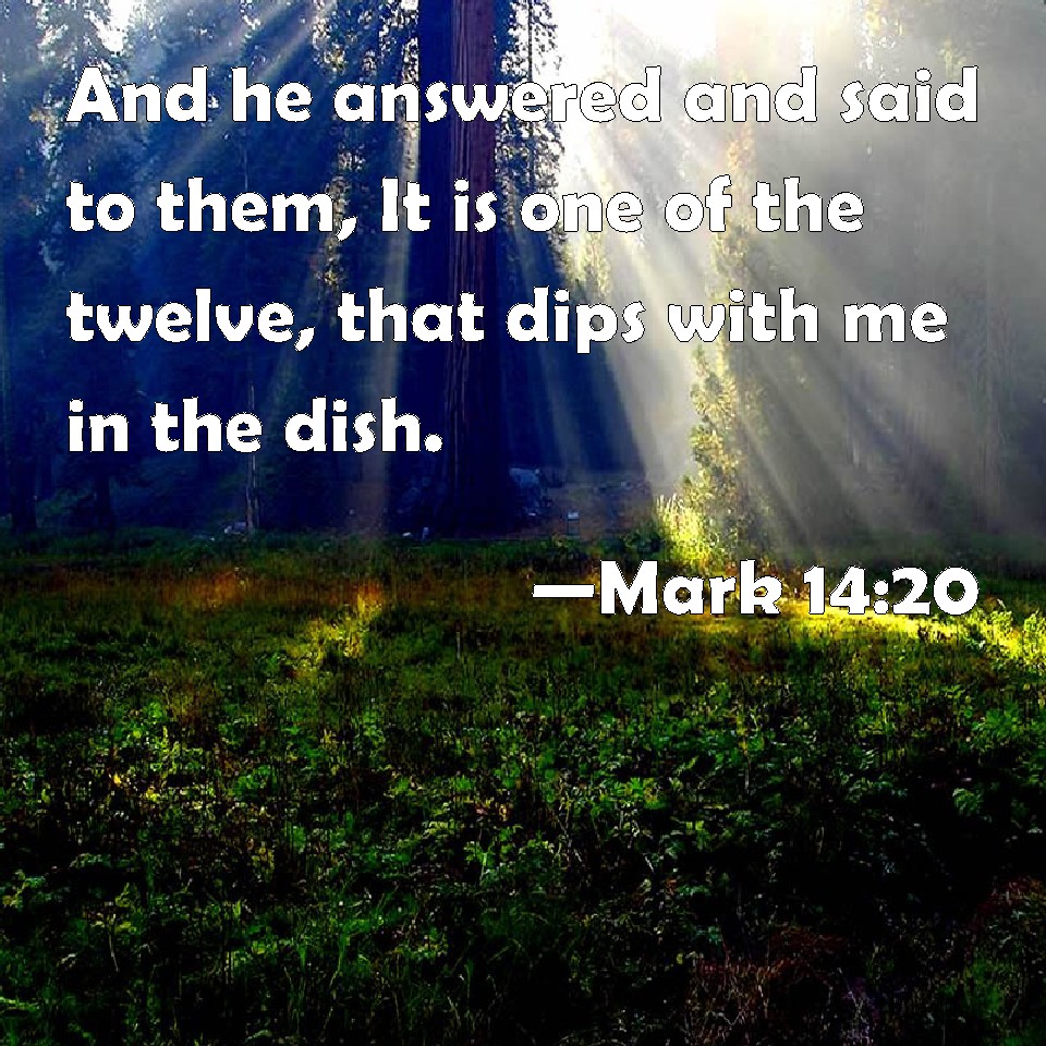 Choose a Background Mark 14:20 And he answered and said to them, It is one of the twelve, that dips with me in the dish. KJV: And he answered and said unto them, It is one of the twelve, that dippeth with me in the dish. DRB: Who saith to them: One of the twelve, who dippeth with me his hand in the dish. DBT: But he answered and said to them, One of the twelve, he who dips with me in the dish. ERV: And he said unto them, It is one of the twelve, he that dippeth with me in the dish. WBT: And he answered and said to them, It is one of the twelve that dippeth with me in the dish. WEB: He answered them, "It is one of the twelve, he who dips with me in the dish. YLT: And he answering said to them, 'One of the twelve who is dipping with me in the dish;Links Mark 14:20 NIV • Mark 14:20 NLT • Mark 14:20 ESV • Mark 14:20 NASB • Mark 14:20 KJV • Mark 14:20 Interlinear • Mark 14:20 Commentaries • Mark 14:20 Parallel Texts • Mark 14:20 Bible Apps • Mark 14:20 Parallel • Bible Hub |