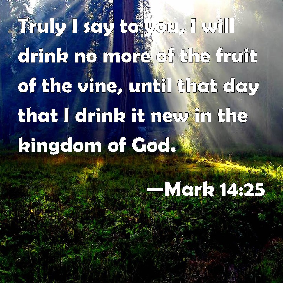 Choose a Background Mark 14:25 Truly I say to you, I will drink no more of the fruit of the vine, until that day that I drink it new in the kingdom of God. KJV: Verily I say unto you, I will drink no more of the fruit of the vine, until that day that I drink it new in the kingdom of God. DRB: Amen I say to you, that I will drink no more of the fruit of the vine, until that day when I shall drink it new in the kingdom of God. DBT: Verily I say to you, I will no more drink at all of the fruit of the vine, until that day when I drink it new in the kingdom of God. ERV: Verily I say unto you, I will no more drink of the fruit of the vine, until that day when I drink it new in the kingdom of God. WBT: Verily I say to you, I will drink no more of the fruit of the vine, until that day that I drink it new in the kingdom of God. WEB: Most certainly I tell you, I will no more drink of the fruit of the vine, until that day when I drink it anew in the Kingdom of God." YLT: verily I say to you, that no more may I drink of the produce of the vine till that day when I may drink it new in the reign of God.'Links Mark 14:25 NIV • Mark 14:25 NLT • Mark 14:25 ESV • Mark 14:25 NASB • Mark 14:25 KJV • Mark 14:25 Interlinear • Mark 14:25 Commentaries • Mark 14:25 Parallel Texts • Mark 14:25 Bible Apps • Mark 14:25 Parallel • Bible Hub |