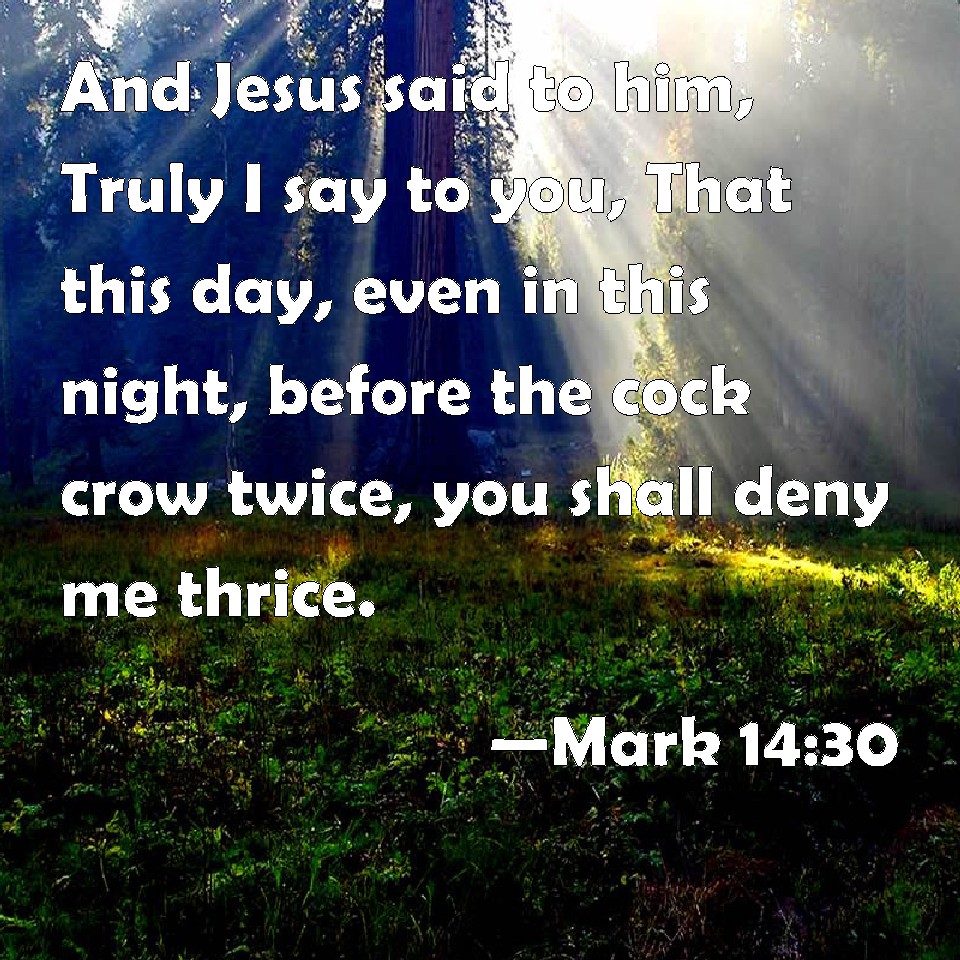 Choose a Background Mark 14:30 And Jesus said to him, Truly I say to you, That this day, even in this night, before the cock crow twice, you shall deny me thrice. KJV: And Jesus saith unto him, Verily I say unto thee, That this day, even in this night, before the cock crow twice, thou shalt deny me thrice. DRB: And Jesus saith to him: Amen I say to thee, to day, even in this night, before the cock crow twice, thou shall deny me thrice. DBT: And Jesus says to him, Verily I say to thee, that thou to-day, in this night, before the cock shall crow twice, thou shalt thrice deny me. ERV: And Jesus saith unto him, Verily I say unto thee, that thou today, even this night, before the cock crow twice, shalt deny me thrice. WBT: And Jesus saith to him, Verily I say to thee, that this day, even in this night, before the cock shall crow twice, thou wilt deny me thrice. WEB: Jesus said to him, "Most certainly I tell you, that you today, even this night, before the rooster crows twice, you will deny me three times." YLT: And Jesus said to him, 'Verily I say to thee, that to-day, this night, before a cock shall crow twice, thrice thou shalt deny me.'Links Mark 14:30 NIV • Mark 14:30 NLT • Mark 14:30 ESV • Mark 14:30 NASB • Mark 14:30 KJV • Mark 14:30 Interlinear • Mark 14:30 Commentaries • Mark 14:30 Parallel Texts • Mark 14:30 Bible Apps • Mark 14:30 Parallel • Bible Hub |