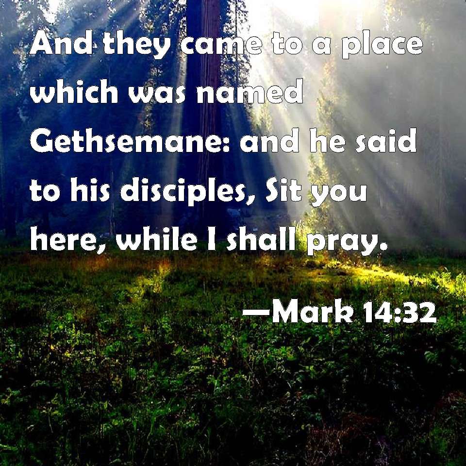 Choose a Background Mark 14:32 And they came to a place which was named Gethsemane: and he said to his disciples, Sit you here, while I shall pray. KJV: And they came to a place which was named Gethsemane: and he saith to his disciples, Sit ye here, while I shall pray. DRB: And they came to a farm called Gethsemani. And he saith to his disciples: Sit you here, while I pray. DBT: And they come to a place of which the name is Gethsemane, and he says to his disciples, Sit here while I shall pray. ERV: And they come unto a place which was named Gethsemane: and he saith unto his disciples, Sit ye here, while I pray. WBT: And they came to a place which was named Gethsemane: and he saith to his disciples, Sit ye here, while I shall pray. WEB: They came to a place which was named Gethsemane. He said to his disciples, "Sit here, while I pray." YLT: And they come to a spot, the name of which is Gethsemane, and he saith to his disciples, 'Sit ye here till I may pray;'Links Mark 14:32 NIV • Mark 14:32 NLT • Mark 14:32 ESV • Mark 14:32 NASB • Mark 14:32 KJV • Mark 14:32 Interlinear • Mark 14:32 Commentaries • Mark 14:32 Parallel Texts • Mark 14:32 Bible Apps • Mark 14:32 Parallel • Bible Hub |