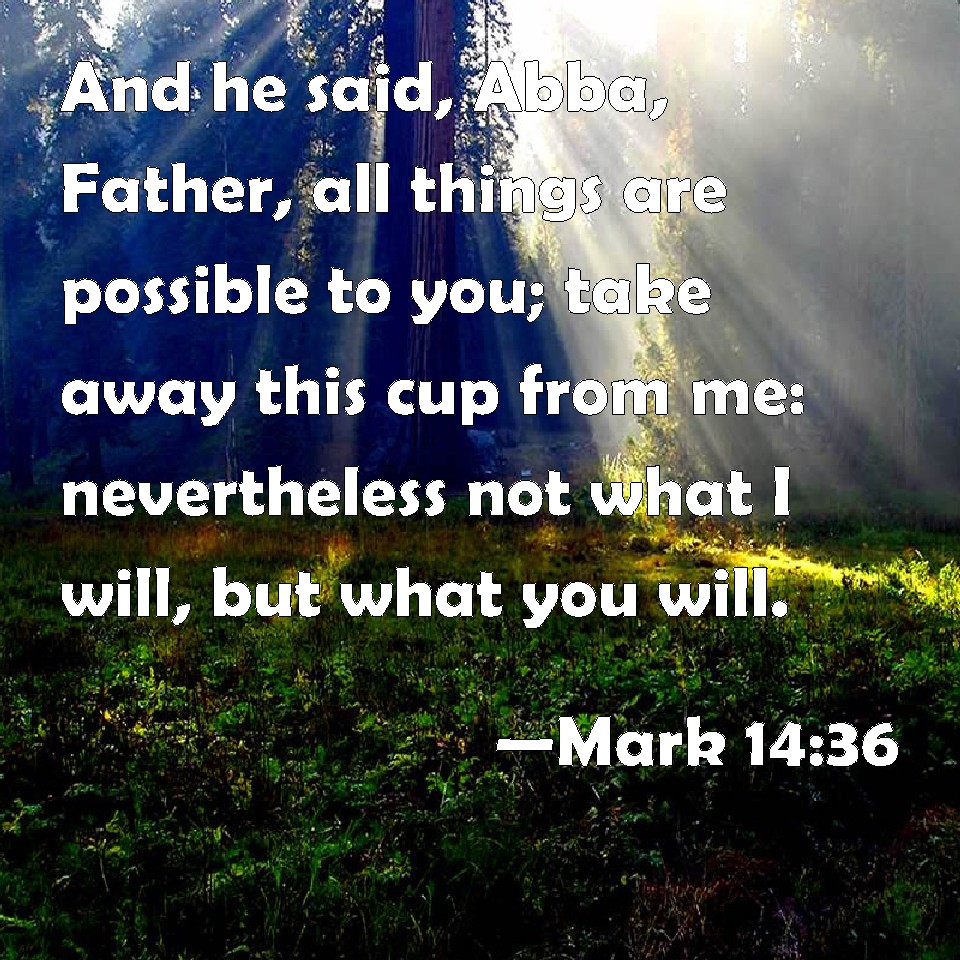 Choose a Background Mark 14:36 And he said, Abba, Father, all things are possible to you; take away this cup from me: nevertheless not what I will, but what you will. KJV: And he said, Abba, Father, all things are possible unto thee; take away this cup from me: nevertheless not what I will, but what thou wilt. DRB: And he saith: Abba, Father, all things are possible to thee: remove this chalice from me; but not what I will, but what thou wilt. DBT: And he said, Abba, Father, all things are possible to thee: take away this cup from me; but not what I will, but what thou wilt. ERV: And he said, Abba, Father, all things are possible unto thee; remove this cup from me: howbeit not what I will, but what thou wilt. WBT: And he said, Abba, Father, all things are possible to thee; take away this cup from me: nevertheless, not what I will, but what thou wilt. WEB: He said, "Abba, Father, all things are possible to you. Please remove this cup from me. However, not what I desire, but what you desire." YLT: and he said, 'Abba, Father; all things are possible to Thee; make this cup pass from me; but, not what I will, but what Thou.'Links Mark 14:36 NIV • Mark 14:36 NLT • Mark 14:36 ESV • Mark 14:36 NASB • Mark 14:36 KJV • Mark 14:36 Interlinear • Mark 14:36 Commentaries • Mark 14:36 Parallel Texts • Mark 14:36 Bible Apps • Mark 14:36 Parallel • Bible Hub |