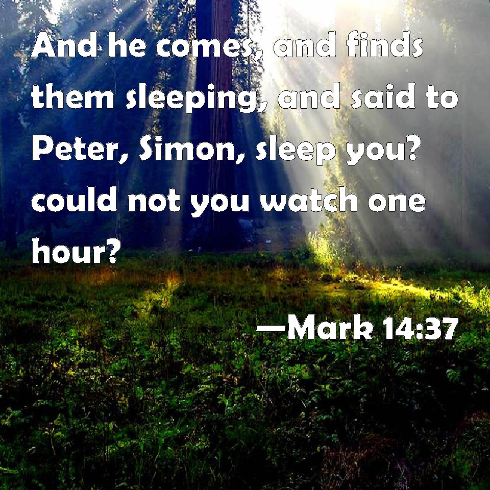 Choose a Background Mark 14:37 And he comes, and finds them sleeping, and said to Peter, Simon, sleep you? could not you watch one hour? KJV: And he cometh, and findeth them sleeping, and saith unto Peter, Simon, sleepest thou? couldest not thou watch one hour? DRB: And he cometh, and findeth them sleeping. And he saith to Peter: Simon, sleepest thou? couldst thou not watch one hour? DBT: And he comes and finds them sleeping. And he says to Peter, Simon, dost thou sleep? Hast thou not been able to watch one hour? ERV: And he cometh, and findeth them sleeping, and saith unto Peter, Simon, sleepest thou? couldest thou not watch one hour? WBT: And he cometh, and findeth them sleeping, and saith to Peter, Simon, sleepest thou? couldst not thou watch one hour? WEB: He came and found them sleeping, and said to Peter, "Simon, are you sleeping? Couldn't you watch one hour? YLT: And he cometh, and findeth them sleeping, and saith to Peter, 'Simon, thou dost sleep! thou wast not able to watch one hour!Links Mark 14:37 NIV • Mark 14:37 NLT • Mark 14:37 ESV • Mark 14:37 NASB • Mark 14:37 KJV • Mark 14:37 Interlinear • Mark 14:37 Commentaries • Mark 14:37 Parallel Texts • Mark 14:37 Bible Apps • Mark 14:37 Parallel • Bible Hub |