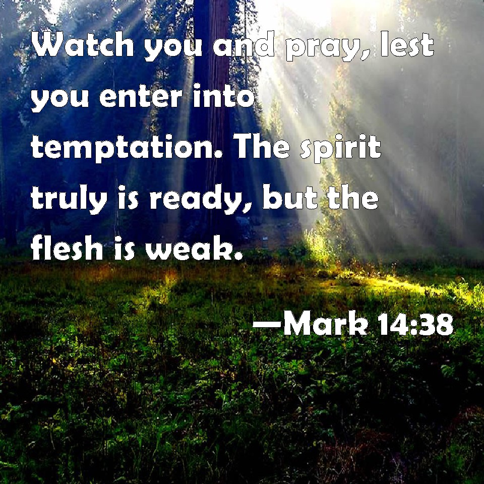 Choose a Background Mark 14:38 Watch you and pray, lest you enter into temptation. The spirit truly is ready, but the flesh is weak. KJV: Watch ye and pray, lest ye enter into temptation. The spirit truly is ready, but the flesh is weak. DRB: Watch ye, and pray that you enter not into temptation. The spirit indeed is willing, but the flesh is weak. DBT: Watch and pray, that ye enter not into temptation. The spirit indeed is willing, but the flesh weak. ERV: Watch and pray, that ye enter not into temptation: the spirit indeed is willing, but the flesh is weak. WBT: Watch ye and pray, lest ye enter into temptation. The spirit truly is ready, but the flesh is weak. WEB: Watch and pray, that you may not enter into temptation. The spirit indeed is willing, but the flesh is weak." YLT: Watch ye and pray, that ye may not enter into temptation; the spirit indeed is forward, but the flesh weak.'Links Mark 14:38 NIV • Mark 14:38 NLT • Mark 14:38 ESV • Mark 14:38 NASB • Mark 14:38 KJV • Mark 14:38 Interlinear • Mark 14:38 Commentaries • Mark 14:38 Parallel Texts • Mark 14:38 Bible Apps • Mark 14:38 Parallel • Bible Hub |