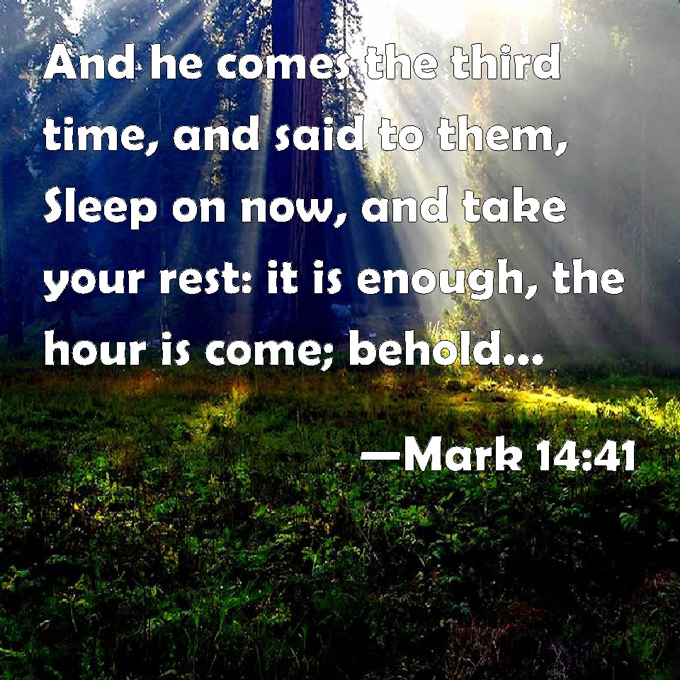 Choose a Background Mark 14:41 And he comes the third time, and said to them, Sleep on now, and take your rest: it is enough, the hour is come; behold, the Son of man is betrayed into the hands of sinners. KJV: And he cometh the third time, and saith unto them, Sleep on now, and take your rest: it is enough, the hour is come; behold, the Son of man is betrayed into the hands of sinners. DRB: And he cometh the third time, and saith to them: Sleep ye now, and take your rest. It is enough: the hour is come: behold the Son of man shall be betrayed into the hands of sinners. DBT: And he comes the third time and says to them, Sleep on now, and take your rest. It is enough; the hour is come; behold, the Son of man is delivered up into the hands of sinners. ERV: And he cometh the third time, and saith unto them, Sleep on now, and take your rest: it is enough; the hour is come; behold, the Son of man is betrayed into the hands of sinners. WBT: And he cometh the third time, and saith to them, Sleep on now, and take your rest: it is enough, the hour is come; behold, the Son of man is betrayed into the hands of sinners. WEB: He came the third time, and said to them, "Sleep on now, and take your rest. It is enough. The hour has come. Behold, the Son of Man is betrayed into the hands of sinners. YLT: And he cometh the third time, and saith to them, 'Sleep on henceforth, and rest — it is over; the hour did come; lo, the Son of Man is delivered up to the hands of the sinful;Links Mark 14:41 NIV • Mark 14:41 NLT • Mark 14:41 ESV • Mark 14:41 NASB • Mark 14:41 KJV • Mark 14:41 Interlinear • Mark 14:41 Commentaries • Mark 14:41 Parallel Texts • Mark 14:41 Bible Apps • Mark 14:41 Parallel • Bible Hub |