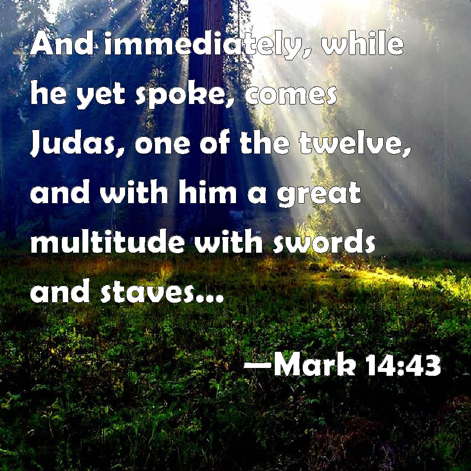 Choose a Background Mark 14:43 And immediately, while he yet spoke, comes Judas, one of the twelve, and with him a great multitude with swords and staves, from the chief priests and the scribes and the elders. KJV: And immediately, while he yet spake, cometh Judas, one of the twelve, and with him a great multitude with swords and staves, from the chief priests and the scribes and the elders. DRB: And while he was yet speaking, cometh Judas Iscariot, one of the twelve: and with him a great multitude with swords and staves, from the chief priests and the scribes and the ancients. DBT: And immediately, while he was yet speaking, Judas comes up, being one of the twelve, and with him a great crowd, with swords and sticks, from the chief priests and the scribes and the elders. ERV: And straightway, while he yet spake, cometh Judas, one of the twelve, and with him a multitude with swords and staves, from the chief priests and the scribes and the elders. WBT: And immediately while he was yet speaking, cometh Judas, one of the twelve, and with him a great multitude with swords and staffs, from the chief priests, and the scribes, and the elders. WEB: Immediately, while he was still speaking, Judas, one of the twelve, came—and with him a multitude with swords and clubs, from the chief priests, the scribes, and the elders. YLT: And immediately — while he is yet speaking — cometh near Judas, one of the twelve, and with him a great multitude, with swords and sticks, from the chief priests, and the scribes, and the elders;Links Mark 14:43 NIV • Mark 14:43 NLT • Mark 14:43 ESV • Mark 14:43 NASB • Mark 14:43 KJV • Mark 14:43 Interlinear • Mark 14:43 Commentaries • Mark 14:43 Parallel Texts • Mark 14:43 Bible Apps • Mark 14:43 Parallel • Bible Hub |