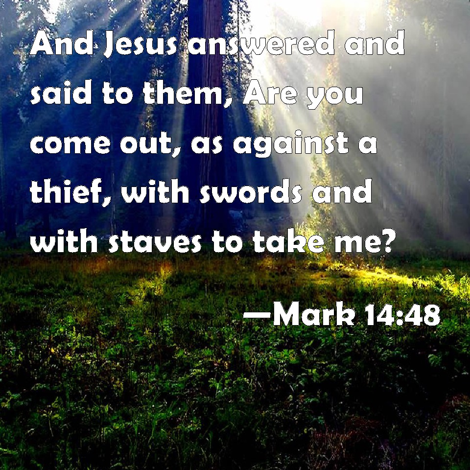 Choose a Background Mark 14:48 And Jesus answered and said to them, Are you come out, as against a thief, with swords and with staves to take me? KJV: And Jesus answered and said unto them, Are ye come out, as against a thief, with swords and with staves to take me? DRB: And Jesus answering, said to them: Are you come out as to a robber, with swords and staves to apprehend me? DBT: And Jesus answering said to them, Are ye come out as against a robber, with swords and sticks to take me? ERV: And Jesus answered and said unto them, Are ye come out, as against a robber, with swords and staves to seize me? WBT: And Jesus answered and said to them, Have ye come out, as against a thief, with swords and with staffs to take me? WEB: Jesus answered them, "Have you come out, as against a robber, with swords and clubs to seize me? YLT: And Jesus answering said to them, 'As against a robber ye came out, with swords and sticks, to take me!Links Mark 14:48 NIV • Mark 14:48 NLT • Mark 14:48 ESV • Mark 14:48 NASB • Mark 14:48 KJV • Mark 14:48 Interlinear • Mark 14:48 Commentaries • Mark 14:48 Parallel Texts • Mark 14:48 Bible Apps • Mark 14:48 Parallel • Bible Hub |