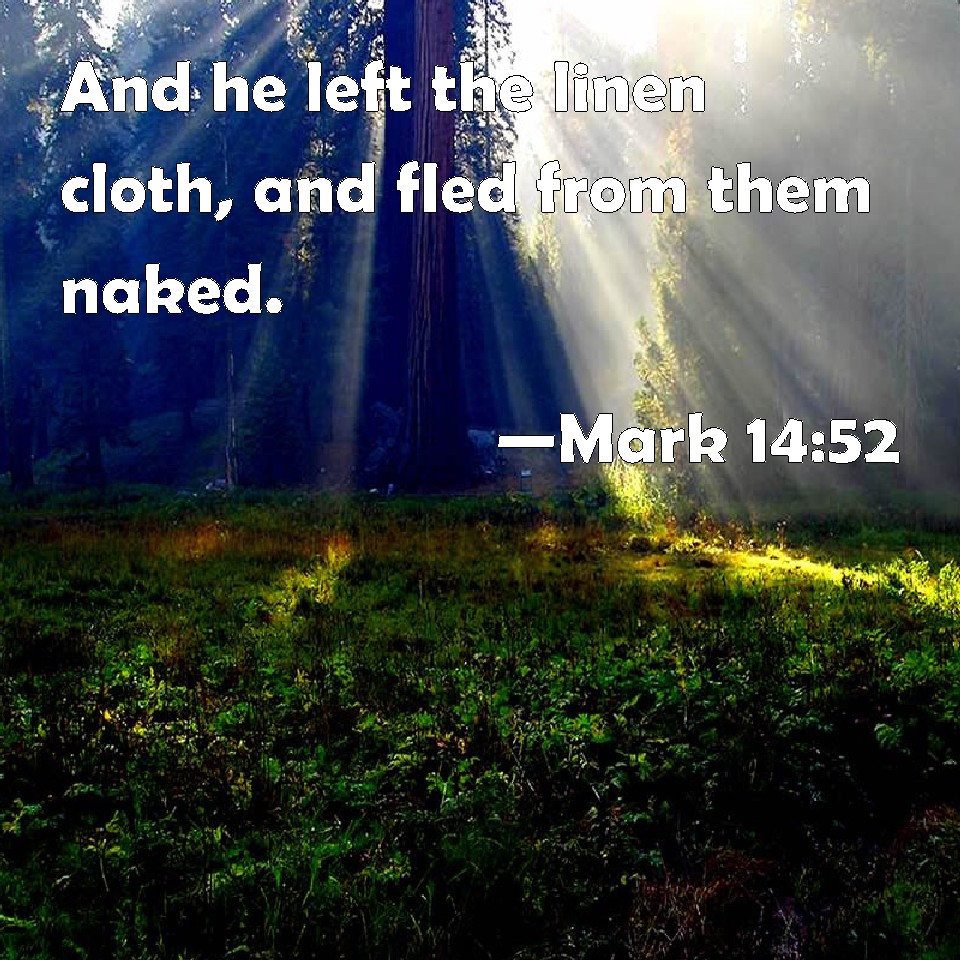 Choose a Background Mark 14:52 And he left the linen cloth, and fled from them naked. KJV: And he left the linen cloth, and fled from them naked. DRB: But he, casting off the linen cloth, fled from them naked. DBT: but he, leaving the linen cloth behind him, fled from them naked. ERV: but he left the linen cloth, and fled naked. WBT: And he left the linen cloth, and fled from them naked. WEB: but he left the linen cloth, and fled from them naked. YLT: and he, having left the linen cloth, did flee from them naked.Links Mark 14:52 NIV • Mark 14:52 NLT • Mark 14:52 ESV • Mark 14:52 NASB • Mark 14:52 KJV • Mark 14:52 Interlinear • Mark 14:52 Commentaries • Mark 14:52 Parallel Texts • Mark 14:52 Bible Apps • Mark 14:52 Parallel • Bible Hub |