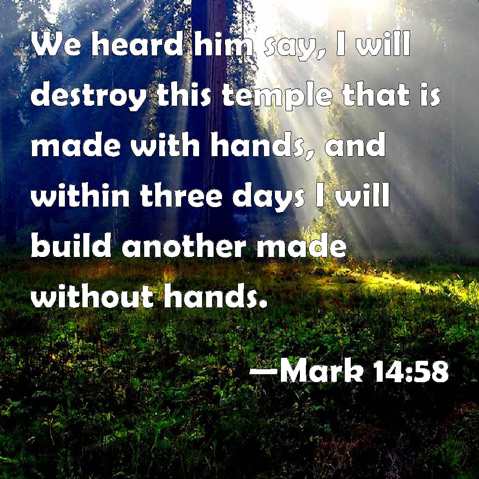 Choose a Background Mark 14:58 We heard him say, I will destroy this temple that is made with hands, and within three days I will build another made without hands. KJV: We heard him say, I will destroy this temple that is made with hands, and within three days I will build another made without hands. DRB: We heard him say, I will destroy this temple made with hands, and within three days I will build another not made with hands. DBT: We heard him saying, I will destroy this temple which is made with hands, and in the course of three days I will build another not made with hands. ERV: We heard him say, I will destroy this temple that is made with hands, and in three days I will build another made without hands. WBT: We heard him say, I will destroy this temple that is made with hands, and within three days I will build another made without hands. WEB: "We heard him say, 'I will destroy this temple that is made with hands, and in three days I will build another made without hands.'" YLT: We heard him saying — I will throw down this sanctuary made with hands, and by three days, another made without hands I will build;'Links Mark 14:58 NIV • Mark 14:58 NLT • Mark 14:58 ESV • Mark 14:58 NASB • Mark 14:58 KJV • Mark 14:58 Interlinear • Mark 14:58 Commentaries • Mark 14:58 Parallel Texts • Mark 14:58 Bible Apps • Mark 14:58 Parallel • Bible Hub |
