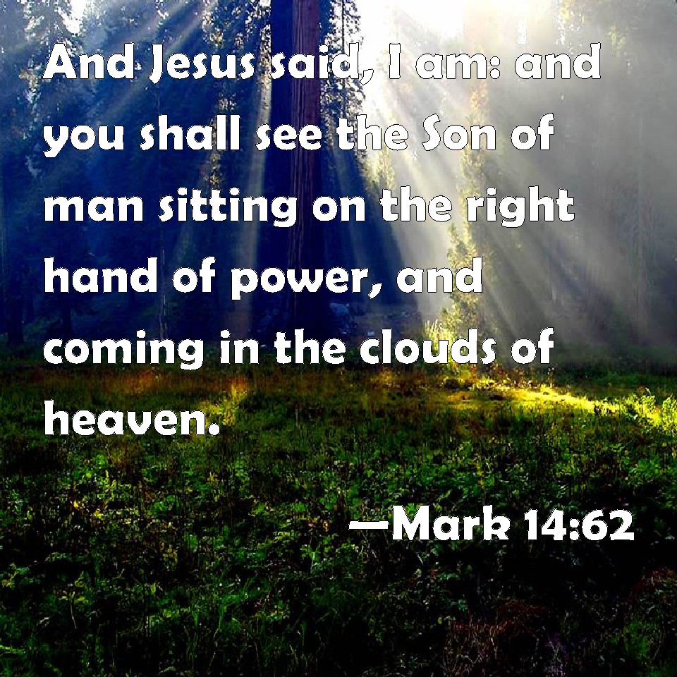 Choose a Background Mark 14:62 And Jesus said, I am: and you shall see the Son of man sitting on the right hand of power, and coming in the clouds of heaven. KJV: And Jesus said, I am: and ye shall see the Son of man sitting on the right hand of power, and coming in the clouds of heaven. DRB: And Jesus said to him: I am. And you shall see the Son of man sitting on the right hand of the power of God, and coming with the clouds of heaven. DBT: And Jesus said, I am, and ye shall see the Son of man sitting at the right hand of power, and coming with the clouds of heaven. ERV: And Jesus said, I am: and ye shall see the Son of man sitting at the right hand of power, and coming with the clouds of heaven. WBT: And Jesus said, I am: and ye shall see the Son of man sitting on the right hand of power, and coming in the clouds of heaven. WEB: Jesus said, "I am. You will see the Son of Man sitting at the right hand of Power, and coming with the clouds of the sky." YLT: and Jesus said, 'I am; and ye shall see the Son of Man sitting on the right hand of the power, and coming with the clouds, of the heaven.'Links Mark 14:62 NIV • Mark 14:62 NLT • Mark 14:62 ESV • Mark 14:62 NASB • Mark 14:62 KJV • Mark 14:62 Interlinear • Mark 14:62 Commentaries • Mark 14:62 Parallel Texts • Mark 14:62 Bible Apps • Mark 14:62 Parallel • Bible Hub |