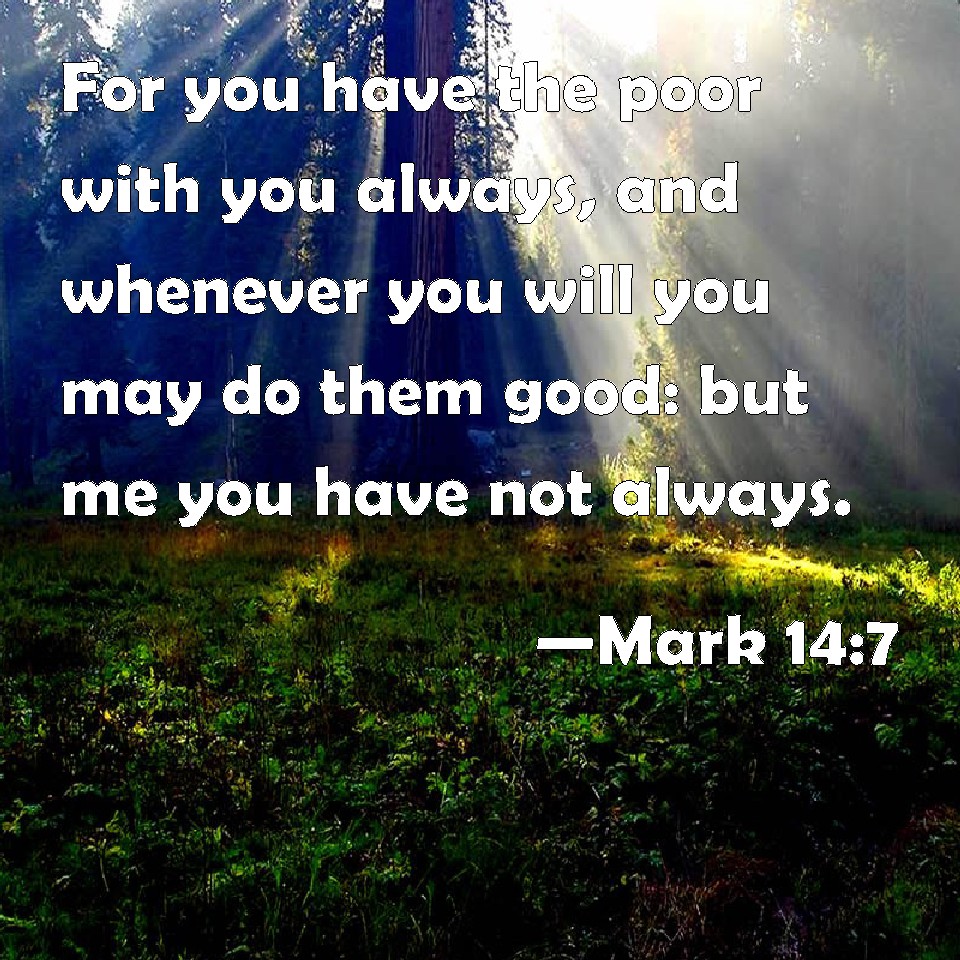 Choose a Background Mark 14:7 For you have the poor with you always, and whenever you will you may do them good: but me you have not always. KJV: For ye have the poor with you always, and whensoever ye will ye may do them good: but me ye have not always. DRB: For the poor you have always with you: and whensoever you will, you may do them good: but me you have not always. DBT: for ye have the poor always with you, and whenever ye would ye can do them good; but me ye have not always. ERV: For ye have the poor always with you, and whensoever ye will ye can do them good: but me ye have not always. WBT: For ye have the poor with you always, and whenever ye will ye may do them good: but me ye have not always. WEB: For you always have the poor with you, and whenever you want to, you can do them good; but you will not always have me. YLT: for the poor always ye have with you, and whenever ye may will ye are able to do them good, but me ye have not always;Links Mark 14:7 NIV • Mark 14:7 NLT • Mark 14:7 ESV • Mark 14:7 NASB • Mark 14:7 KJV • Mark 14:7 Interlinear • Mark 14:7 Commentaries • Mark 14:7 Parallel Texts • Mark 14:7 Bible Apps • Mark 14:7 Parallel • Bible Hub |