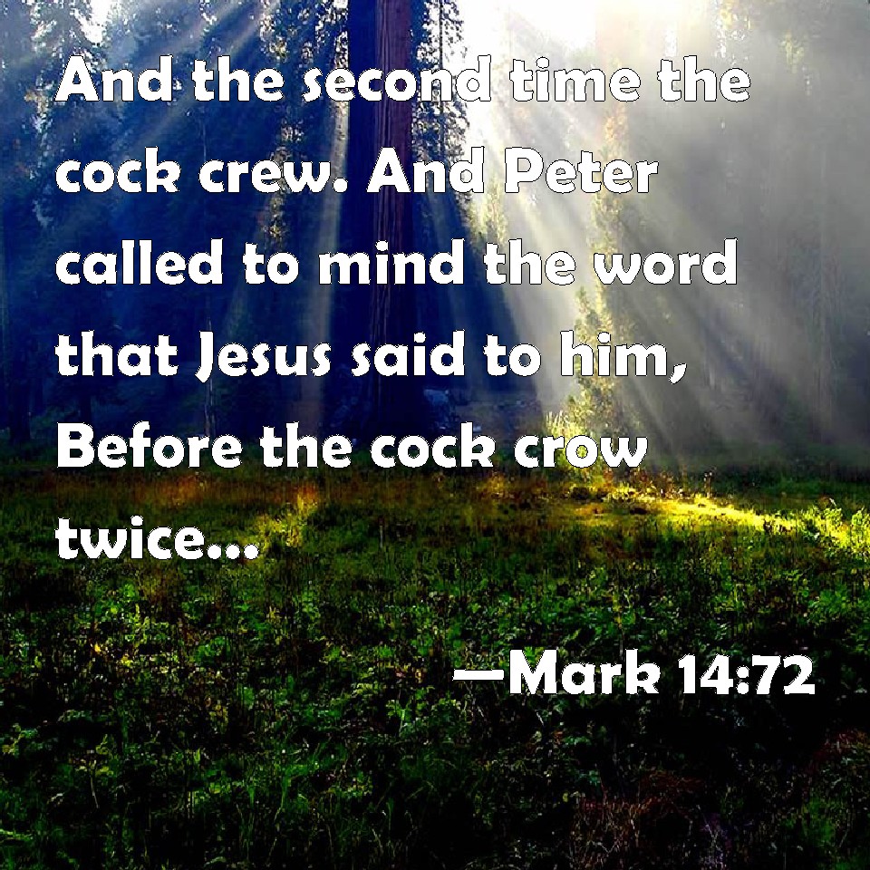 Choose a Background Mark 14:72 And the second time the cock crew. And Peter called to mind the word that Jesus said to him, Before the cock crow twice, you shall deny me thrice. And when he thought thereon, he wept. KJV: And the second time the cock crew. And Peter called to mind the word that Jesus said unto him, Before the cock crow twice, thou shalt deny me thrice. And when he thought thereon, he wept. DRB: And immediately the cock crew again. And Peter remembered the word that Jesus had said unto him: Before the cock crow twice, thou shalt thrice deny me. And he began to weep. DBT: And the second time a cock crew. And Peter remembered the word that Jesus said to him, Before the cock crow twice, thou shalt deny me thrice; and when he thought thereon he wept. ERV: And straightway the second time the cock crew. And Peter called to mind the word, how that Jesus said unto him, Before the cock crow twice, thou shalt deny me thrice. And when he thought thereon, he wept. WBT: And the second time the cock crowed. And Peter called to mind the word that Jesus said to him, Before the cock shall crow twice, thou wilt deny me thrice. And when he thought thereon, he wept. WEB: The rooster crowed the second time. Peter remembered the word, how that Jesus said to him, "Before the rooster crows twice, you will deny me three times." When he thought about that, he wept. YLT: and a second time a cock crew, and Peter remembered the saying that Jesus said to him — 'Before a cock crow twice, thou mayest deny me thrice;' and having thought thereon — he was weeping.Links Mark 14:72 NIV • Mark 14:72 NLT • Mark 14:72 ESV • Mark 14:72 NASB • Mark 14:72 KJV • Mark 14:72 Interlinear • Mark 14:72 Commentaries • Mark 14:72 Parallel Texts • Mark 14:72 Bible Apps • Mark 14:72 Parallel • Bible Hub |