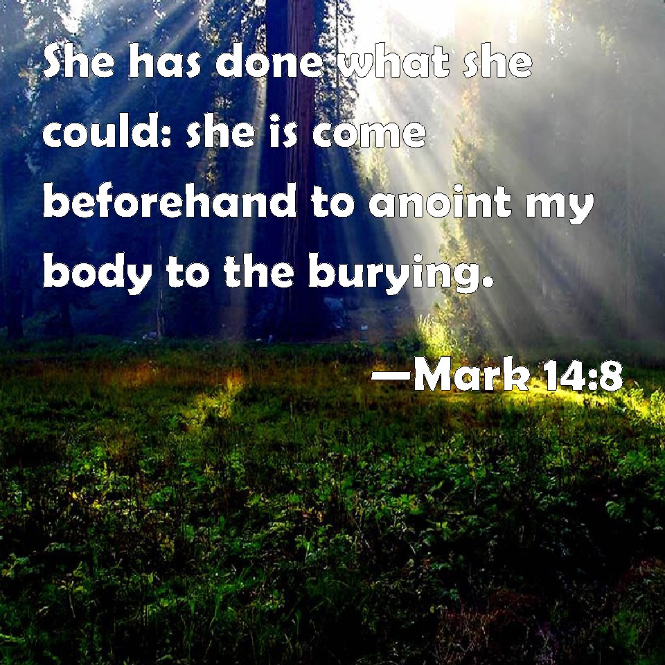 Mark 14:8 She has done what she could: she is come beforehand to anoint my body to the burying.
