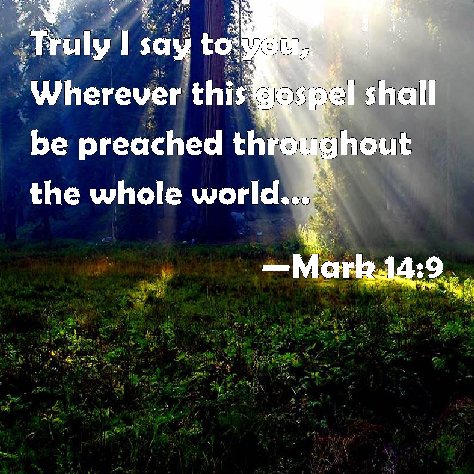 Choose a Background Mark 14:9 Truly I say to you, Wherever this gospel shall be preached throughout the whole world, this also that she has done shall be spoken of for a memorial of her. KJV: Verily I say unto you, Wheresoever this gospel shall be preached throughout the whole world, this also that she hath done shall be spoken of for a memorial of her. DRB: Amen, I say to you, wheresoever this gospel shall be preached in the whole world, that also which she hath done, shall be told for a memorial of her. DBT: And verily I say unto you, Wheresoever these glad tidings may be preached in the whole world, what this woman has done shall be also spoken of for a memorial of her. ERV: And verily I say unto you, Wheresoever the gospel shall be preached throughout the whole world, that also which this woman hath done shall be spoken of for a memorial of her. WBT: Verily I say to you, Wherever this gospel shall be preached throughout the whole world, this also that she hath done shall be spoken of, for a memorial of her. WEB: Most certainly I tell you, wherever this Good News may be preached throughout the whole world, that which this woman has done will also be spoken of for a memorial of her." YLT: Verily I say to you, wherever this good news may be proclaimed in the whole world, what also this woman did shall be spoken of — for a memorial of her.'Links Mark 14:9 NIV • Mark 14:9 NLT • Mark 14:9 ESV • Mark 14:9 NASB • Mark 14:9 KJV • Mark 14:9 Interlinear • Mark 14:9 Commentaries • Mark 14:9 Parallel Texts • Mark 14:9 Bible Apps • Mark 14:9 Parallel • Bible Hub |