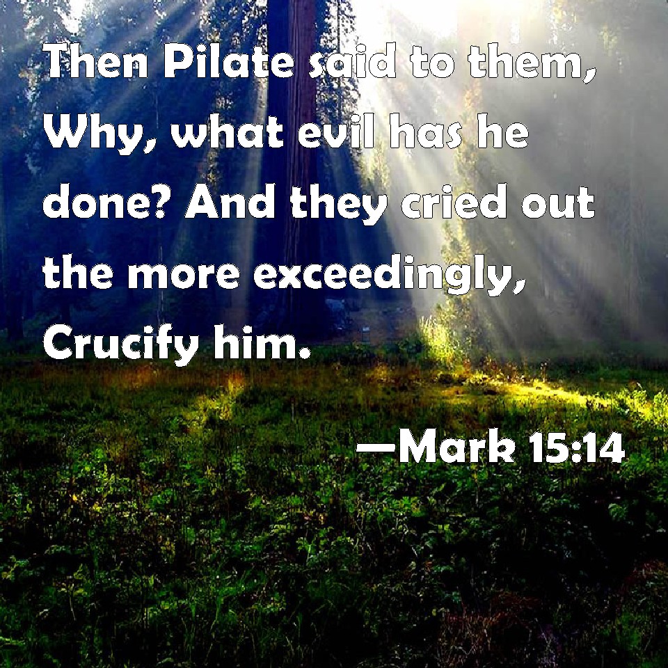 Choose a Background Mark 15:14 Then Pilate said to them, Why, what evil has he done? And they cried out the more exceedingly, Crucify him. KJV: Then Pilate said unto them, Why, what evil hath he done? And they cried out the more exceedingly, Crucify him. DRB: And Pilate saith to them: Why, what evil hath he done? But they cried out the more: Crucify him. DBT: And Pilate said to them, What evil then has he done? But they cried out the more urgently, Crucify him. ERV: And Pilate said unto them, Why, what evil hath he done? But they cried out exceedingly, Crucify him. WBT: Then Pilate said to them, Why, what evil hath he done? And they cried out the more exceedingly, Crucify him. WEB: Pilate said to them, "Why, what evil has he done?" But they cried out exceedingly, "Crucify him!" YLT: And Pilate said to them, 'Why — what evil did he?' and they cried out the more vehemently, 'Crucify him;'Links Mark 15:14 NIV • Mark 15:14 NLT • Mark 15:14 ESV • Mark 15:14 NASB • Mark 15:14 KJV • Mark 15:14 Interlinear • Mark 15:14 Commentaries • Mark 15:14 Parallel Texts • Mark 15:14 Bible Apps • Mark 15:14 Parallel • Bible Hub |