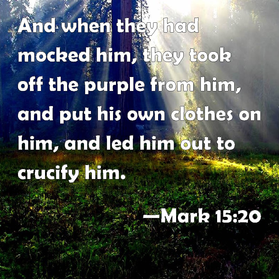 Choose a Background Mark 15:20 And when they had mocked him, they took off the purple from him, and put his own clothes on him, and led him out to crucify him. KJV: And when they had mocked him, they took off the purple from him, and put his own clothes on him, and led him out to crucify him. DRB: And after they had mocked him, they took off the purple from him, and put his own garments on him, and they led him out to crucify him. DBT: And when they had mocked him, they took the purple off him, and put his own clothes on him; and they lead him out that they may crucify him. ERV: And when they had mocked him, they took off from him the purple, and put on him his garments. And they lead him out to crucify him. WBT: And when they had mocked him, they took off the purple from him, and put his own clothes on him, and led him out to crucify him. WEB: When they had mocked him, they took the purple off of him, and put his own garments on him. They led him out to crucify him. YLT: and when they had mocked him, they took the purple from off him, and clothed him in his own garments, and they led him forth, that they may crucify him.Links Mark 15:20 NIV • Mark 15:20 NLT • Mark 15:20 ESV • Mark 15:20 NASB • Mark 15:20 KJV • Mark 15:20 Interlinear • Mark 15:20 Commentaries • Mark 15:20 Parallel Texts • Mark 15:20 Bible Apps • Mark 15:20 Parallel • Bible Hub |
