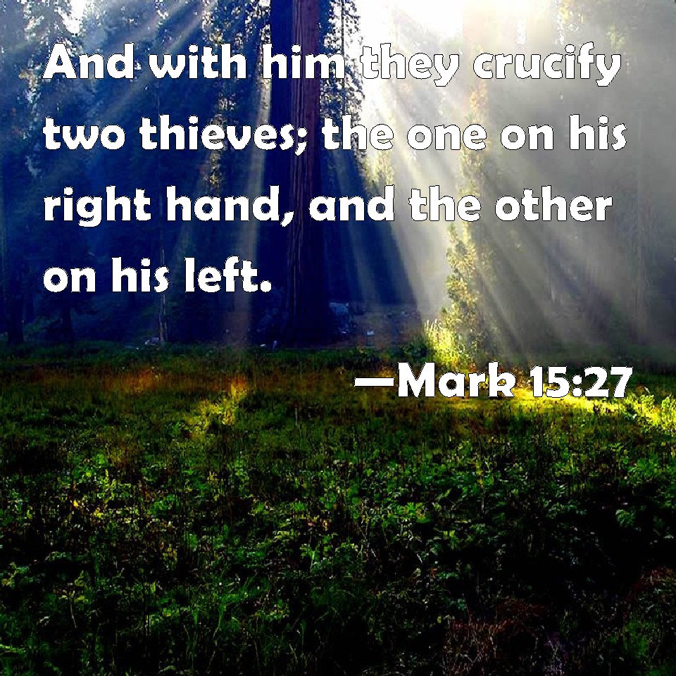 Choose a Background Mark 15:27 And with him they crucify two thieves; the one on his right hand, and the other on his left. KJV: And with him they crucify two thieves; the one on his right hand, and the other on his left. DRB: And with him they crucify two thieves; the one on his right hand, and the other on his left. DBT: And with him they crucify two robbers, one on his right hand, and one on his left. ERV: And with him they crucify two robbers; one on his right hand, and one on his left. WBT: And with him they crucify two thieves, the one on his right hand, and the other on his left. WEB: With him they crucified two robbers; one on his right hand, and one on his left. YLT: And with him they crucify two robbers, one on the right hand, and one on his left,Links Mark 15:27 NIV • Mark 15:27 NLT • Mark 15:27 ESV • Mark 15:27 NASB • Mark 15:27 KJV • Mark 15:27 Interlinear • Mark 15:27 Commentaries • Mark 15:27 Parallel Texts • Mark 15:27 Bible Apps • Mark 15:27 Parallel • Bible Hub |