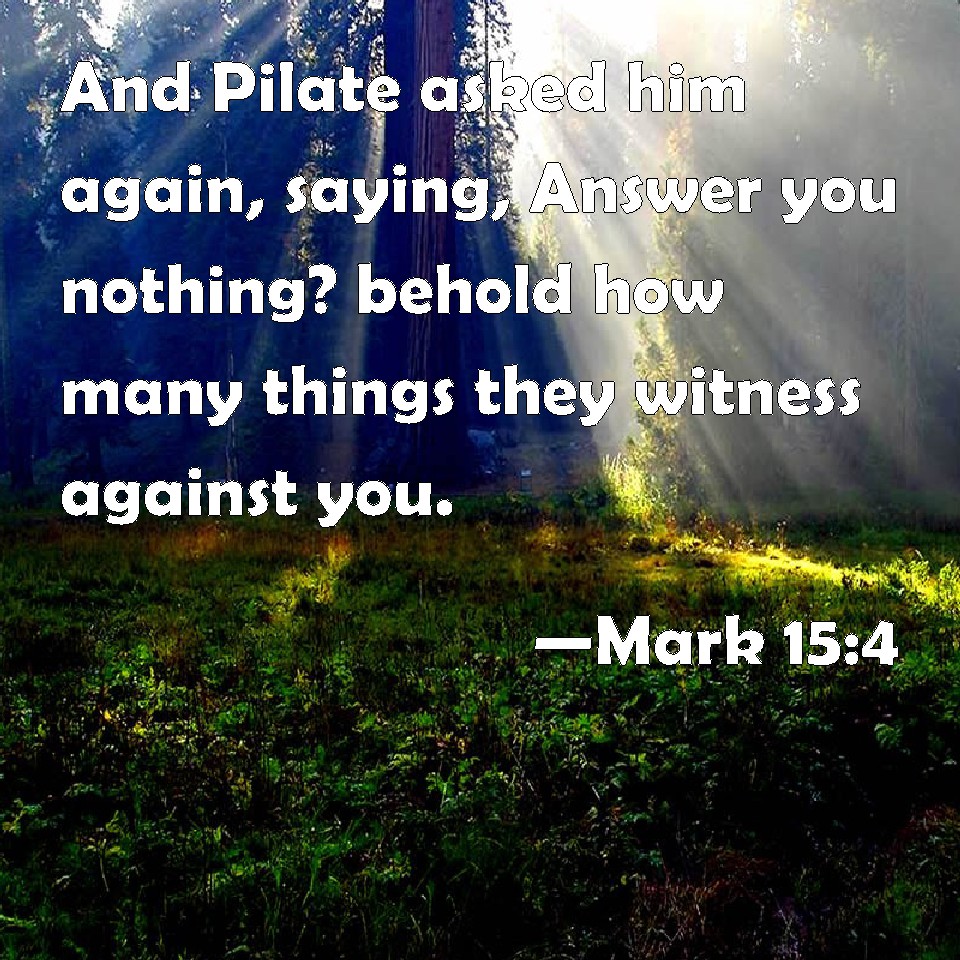 Choose a Background Mark 15:4 And Pilate asked him again, saying, Answer you nothing? behold how many things they witness against you. KJV: And Pilate asked him again, saying, Answerest thou nothing? behold how many things they witness against thee. DRB: And Pilate again asked him, saying: Answerest thou nothing? behold in how many things they accuse thee. DBT: And Pilate asked him again, saying, Answerest thou nothing? See of how many things they bear witness against thee. ERV: And Pilate again asked him, saying, Answerest thou nothing? behold how many things they accuse thee of. WBT: And Pilate asked him again, saying, Answerest thou nothing? behold how many things they testify against thee. WEB: Pilate again asked him, "Have you no answer? See how many things they testify against you!" YLT: And Pilate again questioned him, saying, 'Thou dost not answer anything! lo, how many things they do testify against thee!'Links Mark 15:4 NIV • Mark 15:4 NLT • Mark 15:4 ESV • Mark 15:4 NASB • Mark 15:4 KJV • Mark 15:4 Interlinear • Mark 15:4 Commentaries • Mark 15:4 Parallel Texts • Mark 15:4 Bible Apps • Mark 15:4 Parallel • Bible Hub |