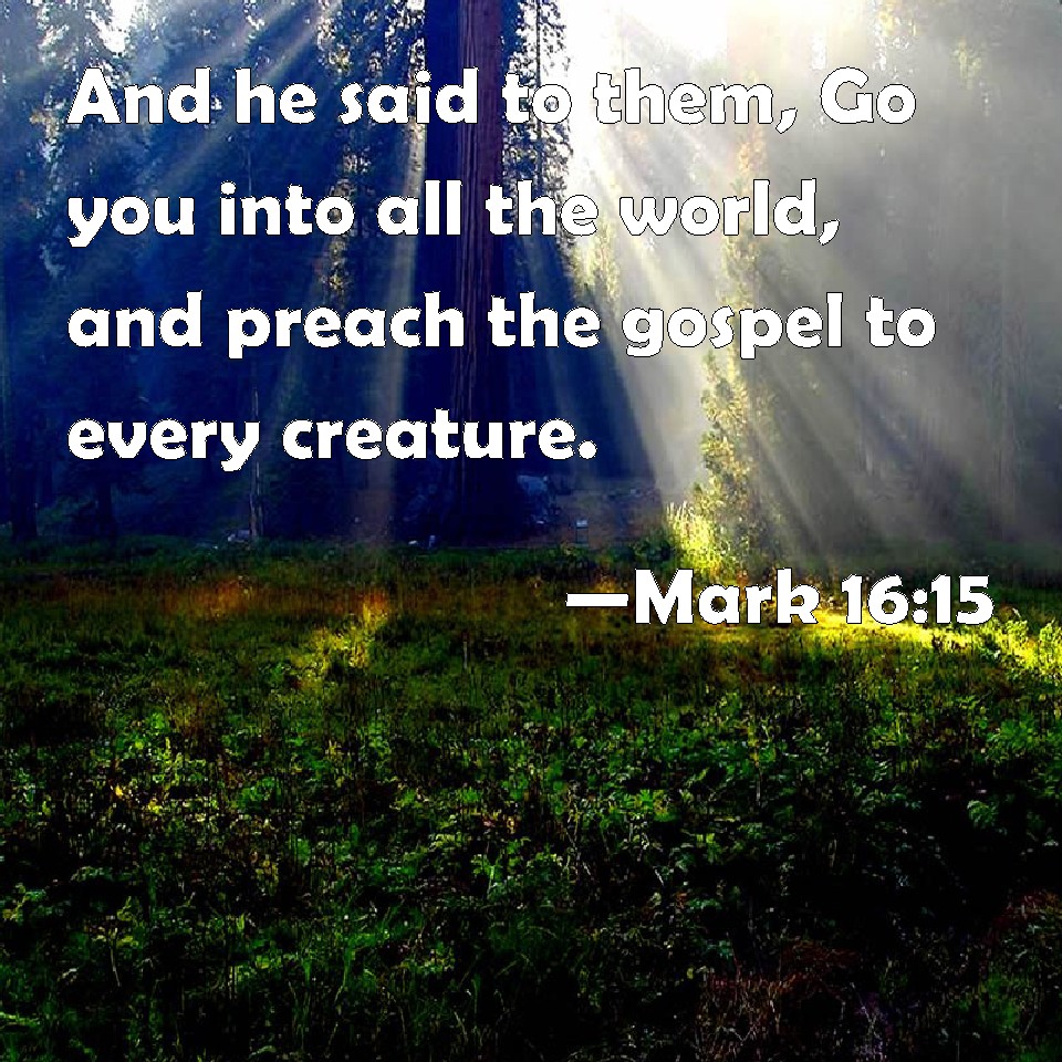 Choose a Background Mark 16:15 And he said to them, Go you into all the world, and preach the gospel to every creature. KJV: And he said unto them, Go ye into all the world, and preach the gospel to every creature. DRB: And he said to them: Go ye into the whole world, and preach the gospel to every creature. DBT: And he said to them, Go into all the world, and preach the glad tidings to all the creation. ERV: And he said unto them, Go ye into all the world, and preach the gospel to the whole creation. WBT: And he said to them, Go ye into all the world, and preach the gospel to every creature. WEB: He said to them, "Go into all the world, and preach the Good News to the whole creation. YLT: and he said to them, 'Having gone to all the world, proclaim the good news to all the creation;Links Mark 16:15 NIV • Mark 16:15 NLT • Mark 16:15 ESV • Mark 16:15 NASB • Mark 16:15 KJV • Mark 16:15 Interlinear • Mark 16:15 Commentaries • Mark 16:15 Parallel Texts • Mark 16:15 Bible Apps • Mark 16:15 Parallel • Bible Hub |