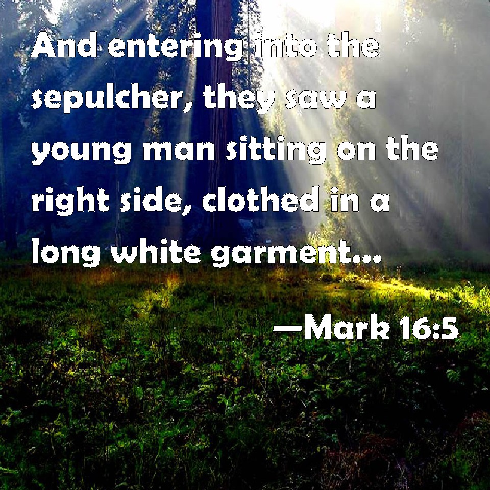 Choose a Background Mark 16:5 And entering into the sepulcher, they saw a young man sitting on the right side, clothed in a long white garment; and they were affrighted. KJV: And entering into the sepulchre, they saw a young man sitting on the right side, clothed in a long white garment; and they were affrighted. DRB: And entering into the sepulchre, they saw a young man sitting on the right side, clothed with a white robe: and they were astonished. DBT: And entering into the sepulchre, they saw a young man sitting on the right, clothed in a white robe, and they were amazed and alarmed; ERV: And entering into the tomb, they saw a young man sitting on the right side, arrayed in a white robe; and they were amazed. WBT: And entering into the sepulcher, they saw a young man sitting on the right side, clothed in a long white garment; and they were frightened. WEB: Entering into the tomb, they saw a young man sitting on the right side, dressed in a white robe, and they were amazed. YLT: and having entered into the sepulchre, they saw a young man sitting on the right hand, arrayed in a long white robe, and they were amazed.Links Mark 16:5 NIV • Mark 16:5 NLT • Mark 16:5 ESV • Mark 16:5 NASB • Mark 16:5 KJV • Mark 16:5 Interlinear • Mark 16:5 Commentaries • Mark 16:5 Parallel Texts • Mark 16:5 Bible Apps • Mark 16:5 Parallel • Bible Hub |