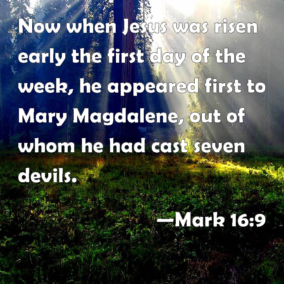 Choose a Background Mark 16:9 Now when Jesus was risen early the first day of the week, he appeared first to Mary Magdalene, out of whom he had cast seven devils. KJV: Now when Jesus was risen early the first day of the week, he appeared first to Mary Magdalene, out of whom he had cast seven devils. DRB: But he rising early the first day of the week, appeared first to Mary Magdalen, out of whom he had cast seven devils. DBT: Now when he had risen very early, the first day of the week, he appeared first to Mary of Magdala, out of whom he had cast seven demons. ERV: Now when he was risen early on the first day of the week, he appeared first to Mary Magdalene, from whom he had cast out seven devils. WBT: Now when Jesus was risen early, the first day of the week, he appeared first to Mary Magdalene, out of whom he had cast seven demons. WEB: Now when he had risen early on the first day of the week, he appeared first to Mary Magdalene, from whom he had cast out seven demons. YLT: And he, having risen in the morning of the first of the sabbaths, did appear first to Mary the Magdalene, out of whom he had cast seven demons;Links Mark 16:9 NIV • Mark 16:9 NLT • Mark 16:9 ESV • Mark 16:9 NASB • Mark 16:9 KJV • Mark 16:9 Interlinear • Mark 16:9 Commentaries • Mark 16:9 Parallel Texts • Mark 16:9 Bible Apps • Mark 16:9 Parallel • Bible Hub |