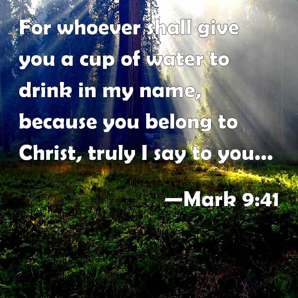 Choose a Background Mark 9:41 For whoever shall give you a cup of water to drink in my name, because you belong to Christ, truly I say to you, he shall not lose his reward. KJV: For whosoever shall give you a cup of water to drink in my name, because ye belong to Christ, verily I say unto you, he shall not lose his reward. DRB: For whosoever shall give you to drink a cup of water in my name, because you belong to Christ: amen I say to you, he shall not lose his reward. DBT: For whosoever shall give you a cup of water to drink in my name, because ye are Christ's, verily I say unto you, he shall in no wise lose his reward. ERV: For whosoever shall give you a cup of water to drink, because ye are Christ's, verily I say unto you, he shall in no wise lose his reward. WBT: For whoever shall give you a cup of water to drink in my name, because ye belong to Christ, verily I say to you, he shall not lose his reward. WEB: For whoever will give you a cup of water to drink in my name, because you are Christ's, most certainly I tell you, he will in no way lose his reward. YLT: for whoever may give you to drink a cup of water in my name, because ye are Christ's, verily I say to you, he may not lose his reward;Links Mark 9:41 NIV • Mark 9:41 NLT • Mark 9:41 ESV • Mark 9:41 NASB • Mark 9:41 KJV • Mark 9:41 Interlinear • Mark 9:41 Commentaries • Mark 9:41 Parallel Texts • Mark 9:41 Bible Apps • Mark 9:41 Parallel • Bible Hub |