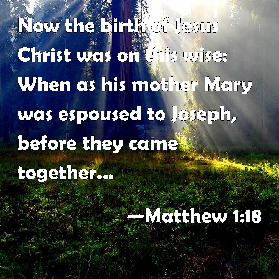 Choose a Background Matthew 1:18 Now the birth of Jesus Christ was on this wise: When as his mother Mary was espoused to Joseph, before they came together, she was found with child of the Holy Ghost. KJV: Now the birth of Jesus Christ was on this wise: When as his mother Mary was espoused to Joseph, before they came together, she was found with child of the Holy Ghost. DRB: Now the generation of Christ was in this wise. When as his mother Mary was espoused to Joseph, before they came together, she was found with child, of the Holy Ghost. DBT: Now the birth of Jesus Christ was thus: His mother, Mary, that is, having been betrothed to Joseph, before they came together, she was found to be with child of the Holy Spirit. ERV: Now the birth of Jesus Christ was on this wise: When his mother Mary had been betrothed to Joseph, before they came together she was found with child of the Holy Ghost. WBT: Now the birth of Jesus Christ was in this manner: When his mother Mary was espoused to Joseph, before they came together, she was found with child by the Holy Spirit. WEB: Now the birth of Jesus Christ was like this; for after his mother, Mary, was engaged to Joseph, before they came together, she was found pregnant by the Holy Spirit. YLT: And of Jesus Christ, the birth was thus: For his mother Mary having been betrothed to Joseph, before their coming together she was found to have conceived from the Holy Spirit,Links Matthew 1:18 NIV • Matthew 1:18 NLT • Matthew 1:18 ESV • Matthew 1:18 NASB • Matthew 1:18 KJV • Matthew 1:18 Interlinear • Matthew 1:18 Commentaries • Matthew 1:18 Parallel Texts • Matthew 1:18 Bible Apps • Matthew 1:18 Parallel • Bible Hub |