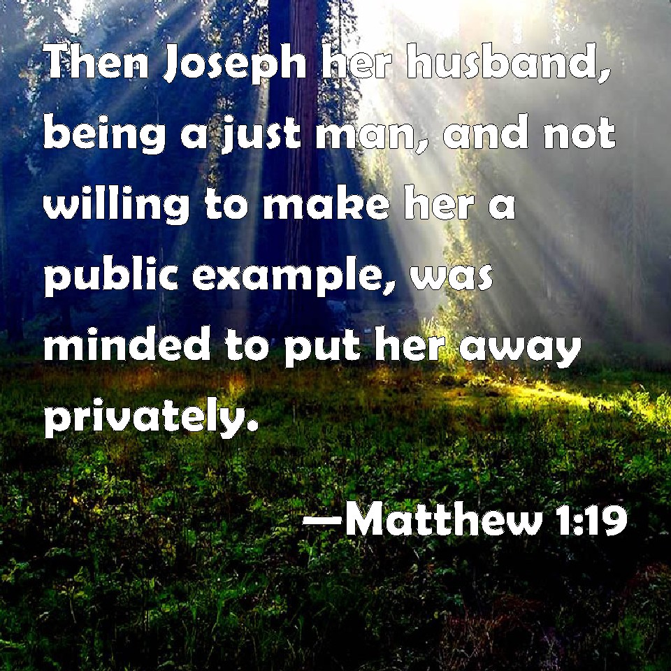 Choose a Background Matthew 1:19 Then Joseph her husband, being a just man, and not willing to make her a public example, was minded to put her away privately. KJV: Then Joseph her husband, being a just man, and not willing to make her a publick example, was minded to put her away privily. DRB: Whereupon Joseph her husband, being a just man, and not willing publicly to expose her, was minded to put her away privately. DBT: But Joseph, her husband, being a righteous man, and unwilling to expose her publicly, purposed to have put her away secretly; ERV: And Joseph her husband, being a righteous man, and not willing to make her a public example, was minded to put her away privily. WBT: Then Joseph her husband, being a just man, and not willing to make her a public example, purposed to put her away privately. WEB: Joseph, her husband, being a righteous man, and not willing to make her a public example, intended to put her away secretly. YLT: and Joseph her husband being righteous, and not willing to make her an example, did wish privately to send her away.Links Matthew 1:19 NIV • Matthew 1:19 NLT • Matthew 1:19 ESV • Matthew 1:19 NASB • Matthew 1:19 KJV • Matthew 1:19 Interlinear • Matthew 1:19 Commentaries • Matthew 1:19 Parallel Texts • Matthew 1:19 Bible Apps • Matthew 1:19 Parallel • Bible Hub |