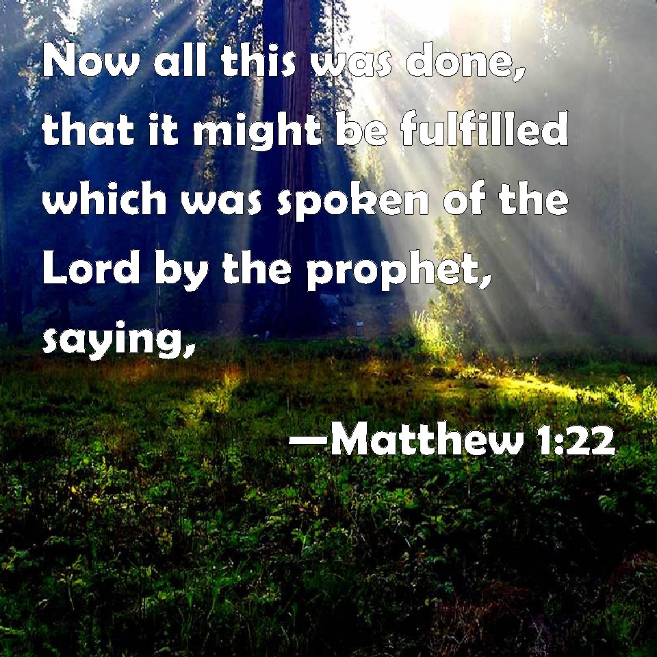Choose a Background Matthew 1:22 Now all this was done, that it might be fulfilled which was spoken of the Lord by the prophet, saying, KJV: Now all this was done, that it might be fulfilled which was spoken of the Lord by the prophet, saying, DRB: Now all this was done that it might be fulfilled which the Lord spoke by the prophet, saying: DBT: Now all this came to pass that that might be fulfilled which was spoken by the Lord, through the prophet, saying, ERV: Now all this is come to pass, that it might be fulfilled which was spoken by the Lord through the prophet, saying, WBT: Now all this was done, that it might be fulfilled which was spoken from the Lord by the prophet, saying, WEB: Now all this has happened, that it might be fulfilled which was spoken by the Lord through the prophet, saying, YLT: And all this hath come to pass, that it may be fulfilled that was spoken by the Lord through the prophet, saying,Links Matthew 1:22 NIV • Matthew 1:22 NLT • Matthew 1:22 ESV • Matthew 1:22 NASB • Matthew 1:22 KJV • Matthew 1:22 Interlinear • Matthew 1:22 Commentaries • Matthew 1:22 Parallel Texts • Matthew 1:22 Bible Apps • Matthew 1:22 Parallel • Bible Hub |