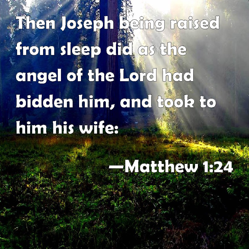 Choose a Background Matthew 1:24 Then Joseph being raised from sleep did as the angel of the Lord had bidden him, and took to him his wife: KJV: Then Joseph being raised from sleep did as the angel of the Lord had bidden him, and took unto him his wife: DRB: And Joseph rising up from sleep, did as the angel of the Lord had commanded him, and took unto him his wife. DBT: But Joseph, having awoke up from his sleep, did as the angel of the Lord had enjoined him, and took to him his wife, ERV: And Joseph arose from his sleep, and did as the angel of the Lord commanded him, and took unto him his wife; WBT: Then Joseph, being raised from sleep, did as the angel of the Lord had bidden him, and took to him his wife: WEB: Joseph arose from his sleep, and did as the angel of the Lord commanded him, and took his wife to himself; YLT: And Joseph, having risen from the sleep, did as the messenger of the Lord directed him, and received his wife,Links Matthew 1:24 NIV • Matthew 1:24 NLT • Matthew 1:24 ESV • Matthew 1:24 NASB • Matthew 1:24 KJV • Matthew 1:24 Interlinear • Matthew 1:24 Commentaries • Matthew 1:24 Parallel Texts • Matthew 1:24 Bible Apps • Matthew 1:24 Parallel • Bible Hub |