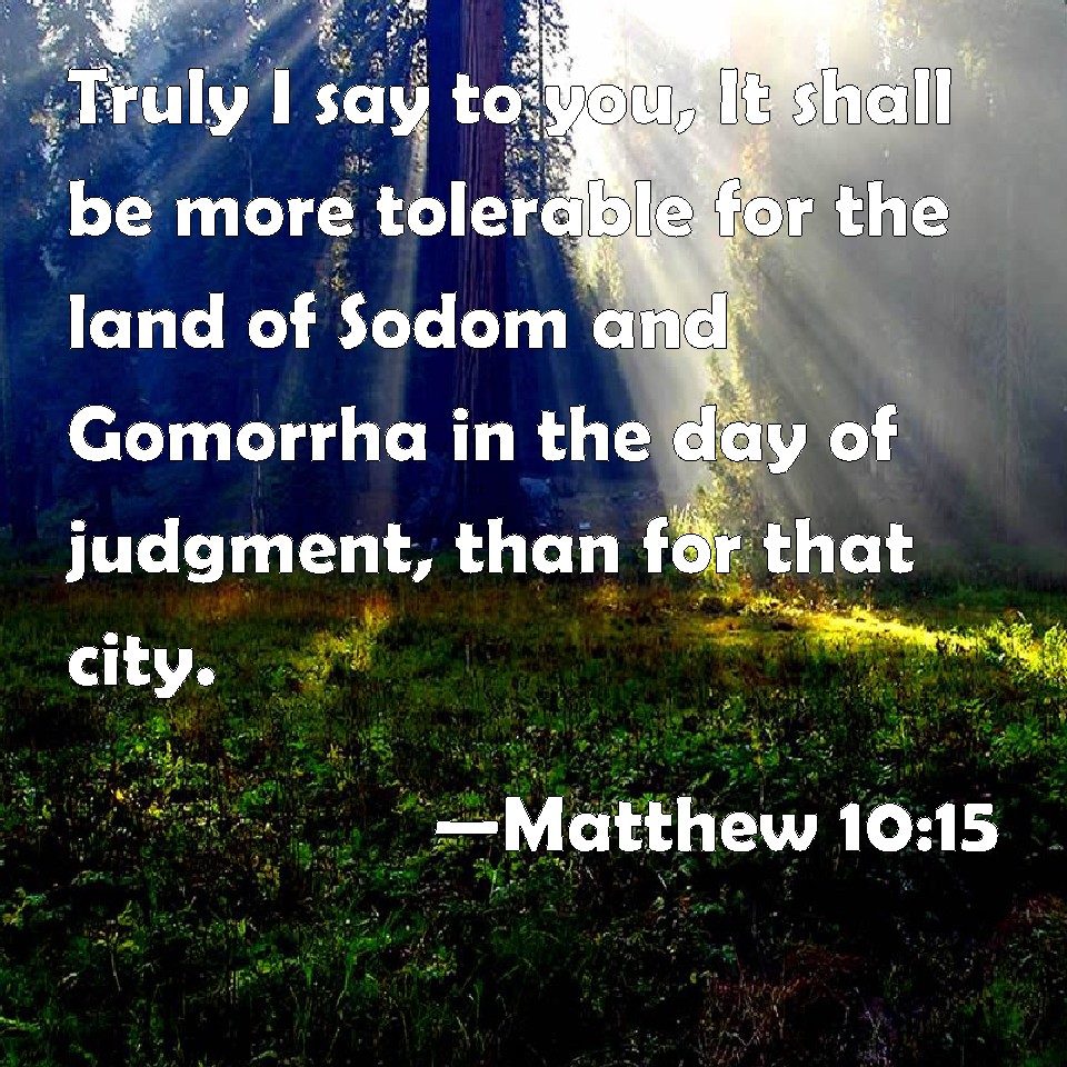 Choose a Background Matthew 10:15 Truly I say to you, It shall be more tolerable for the land of Sodom and Gomorrha in the day of judgment, than for that city. KJV: Verily I say unto you, It shall be more tolerable for the land of Sodom and Gomorrha in the day of judgment, than for that city. DRB: Amen I say to you, it shall be more tolerable for the land of Sodom and Gomorrha in the day of judgment, than for that city. DBT: Verily I say unto you, It shall be more tolerable for the land of Sodom and Gomorrha in judgment-day than for that city. ERV: Verily I say unto you, It shall be more tolerable for the land of Sodom and Gomorrah in the day of judgment, than for that city. WBT: Verily, I say to you, It shall be more tolerable for the land of Sodom and Gomorrah, in the day of judgment, than for that city. WEB: Most certainly I tell you, it will be more tolerable for the land of Sodom and Gomorrah in the day of judgment than for that city. YLT: verily I say to you, It shall be more tolerable for the land of Sodom and Gomorrah in the day of judgment than for that city.Links Matthew 10:15 NIV • Matthew 10:15 NLT • Matthew 10:15 ESV • Matthew 10:15 NASB • Matthew 10:15 KJV • Matthew 10:15 Interlinear • Matthew 10:15 Commentaries • Matthew 10:15 Parallel Texts • Matthew 10:15 Bible Apps • Matthew 10:15 Parallel • Bible Hub |