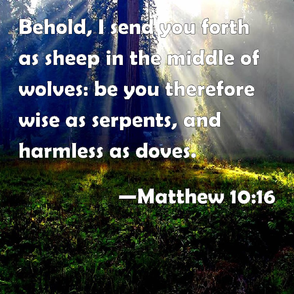 Choose a Background Matthew 10:16 Behold, I send you forth as sheep in the middle of wolves: be you therefore wise as serpents, and harmless as doves. KJV: Behold, I send you forth as sheep in the midst of wolves: be ye therefore wise as serpents, and harmless as doves. DRB: Behold I send you as sheep in the midst of wolves. Be ye therefore wise as serpents and simple as doves. DBT: Behold, I send you as sheep in the midst of wolves; be therefore prudent as the serpents, and guileless as the doves. ERV: Behold, I send you forth as sheep in the midst of wolves: be ye therefore wise as serpents, and harmless as doves. WBT: Behold, I send you forth as sheep in the midst of wolves: be ye therefore wise as serpents, and harmless as doves. WEB: "Behold, I send you out as sheep in the midst of wolves. Therefore be wise as serpents, and harmless as doves. YLT: 'Lo, I do send you forth as sheep in the midst of wolves, be ye therefore wise as the serpents, and simple as the doves.Links Matthew 10:16 NIV • Matthew 10:16 NLT • Matthew 10:16 ESV • Matthew 10:16 NASB • Matthew 10:16 KJV • Matthew 10:16 Interlinear • Matthew 10:16 Commentaries • Matthew 10:16 Parallel Texts • Matthew 10:16 Bible Apps • Matthew 10:16 Parallel • Bible Hub |